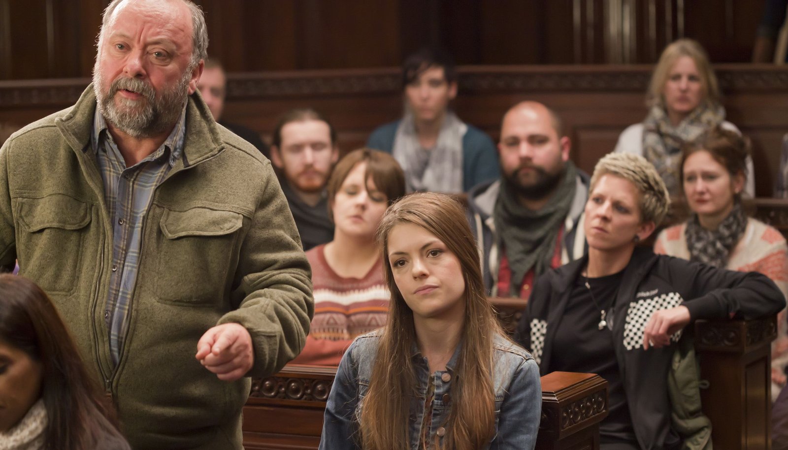 Tote Wasser (1)Evie Watt (Kari Corbett, Mitte) und ihr Vater Cameron (Alex Norton, li.) sind strikt gegen die Pläne des profitorientierten Gasunternehmens.Bild: © ARD Degeto/ITV Studios