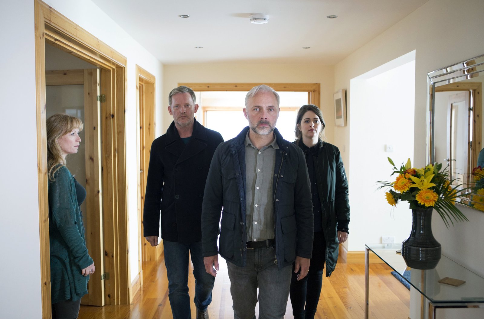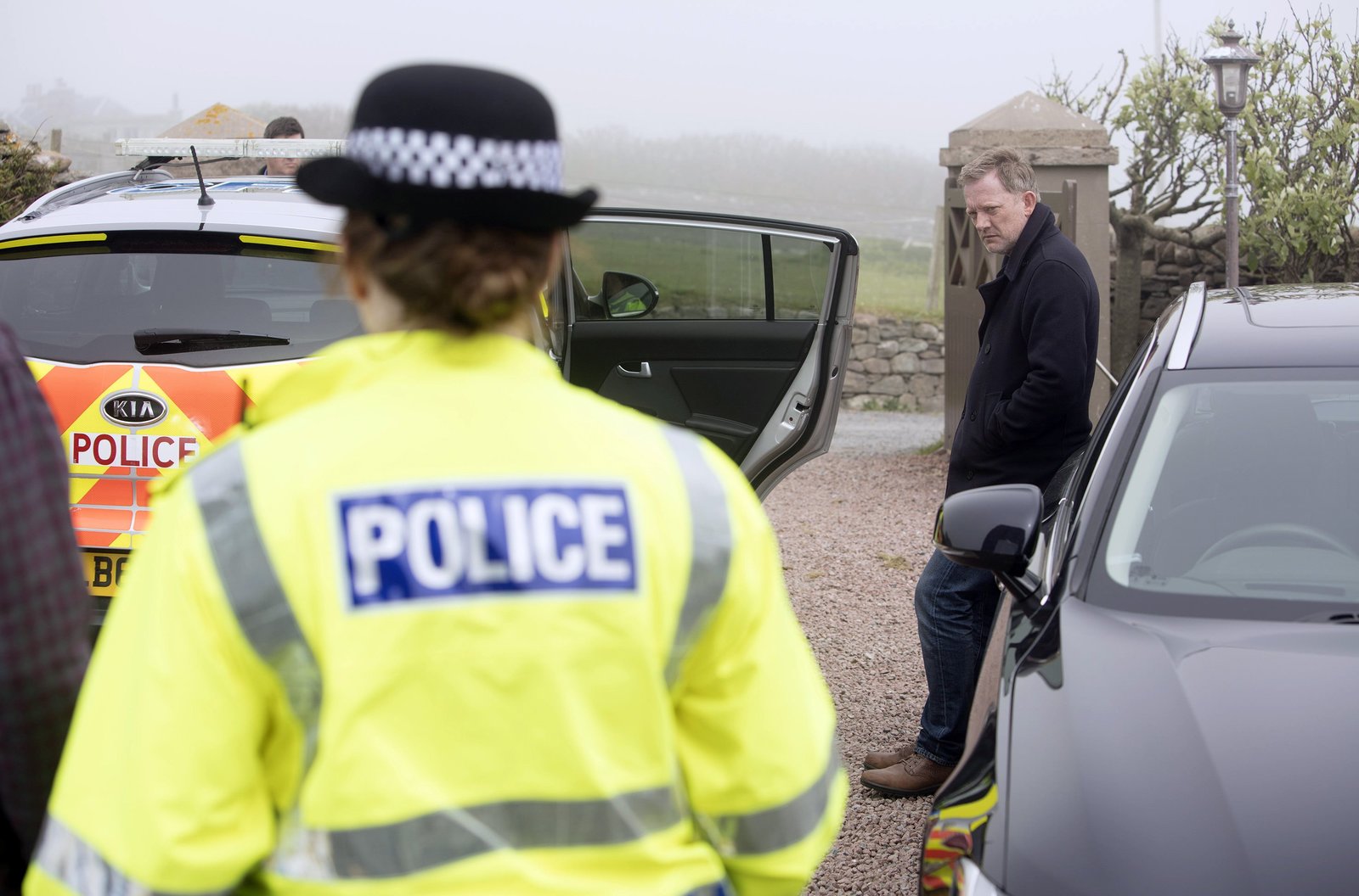 Die Schatten der Vergangenheit (1)ARD Degeto MORD AUF SHETLAND - DIE SCHATTEN DER VERGANGENHEIT, "Shetland - Series 3 (Episodes 5 - 6)", am Montag (13.04.20) um 21:45 Uhr im ERSTEN. Perez (Douglas Henshall) und Tosh (Alison O'Donnell) holen Duncan (Mark Bonnar, vorne) ab. Seine Frau Nina (Hege Schøyen) ist geschockt. © ARD Degeto/ITV Studios, honorarfrei - Verwendung gemäß der AGB im engen inhaltlichen, redaktionellen Zusammenhang mit genannter Degeto-Sendung und bei Nennung "Bild: ARD Degeto/ITV Studios" (S2+). ARD Degeto/Programmplanung und Presse, Tel: 069/1509-335, degeto-presse@degeto.deBild: © ARD Degeto/ITV Studios / ARD Degeto/Programmplanung und P