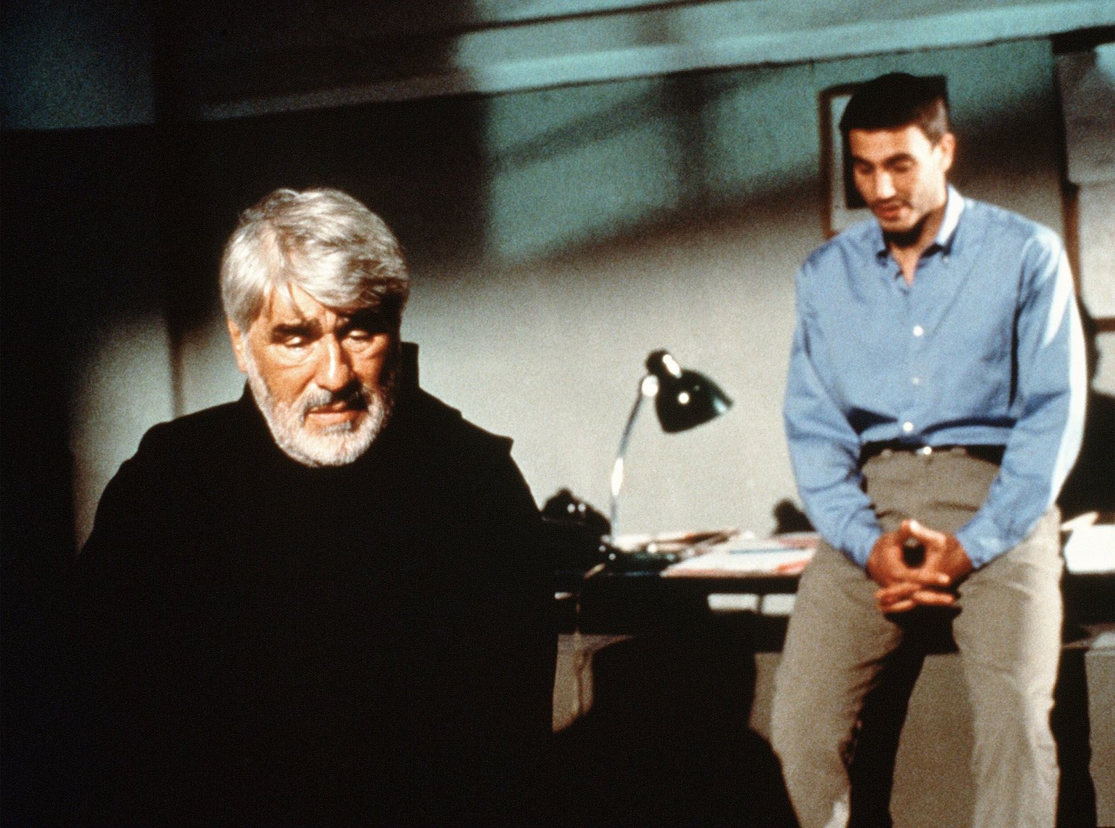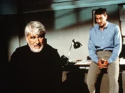 Mord im KlosterKommissar David Serge (Daniele Liotti, re.) teilt dem erschütterten Pater Zereffino (Mario Adorf) mit, dass sein Bruder tödlich verunglückt ist.Bild: © ARD/DEGETO
