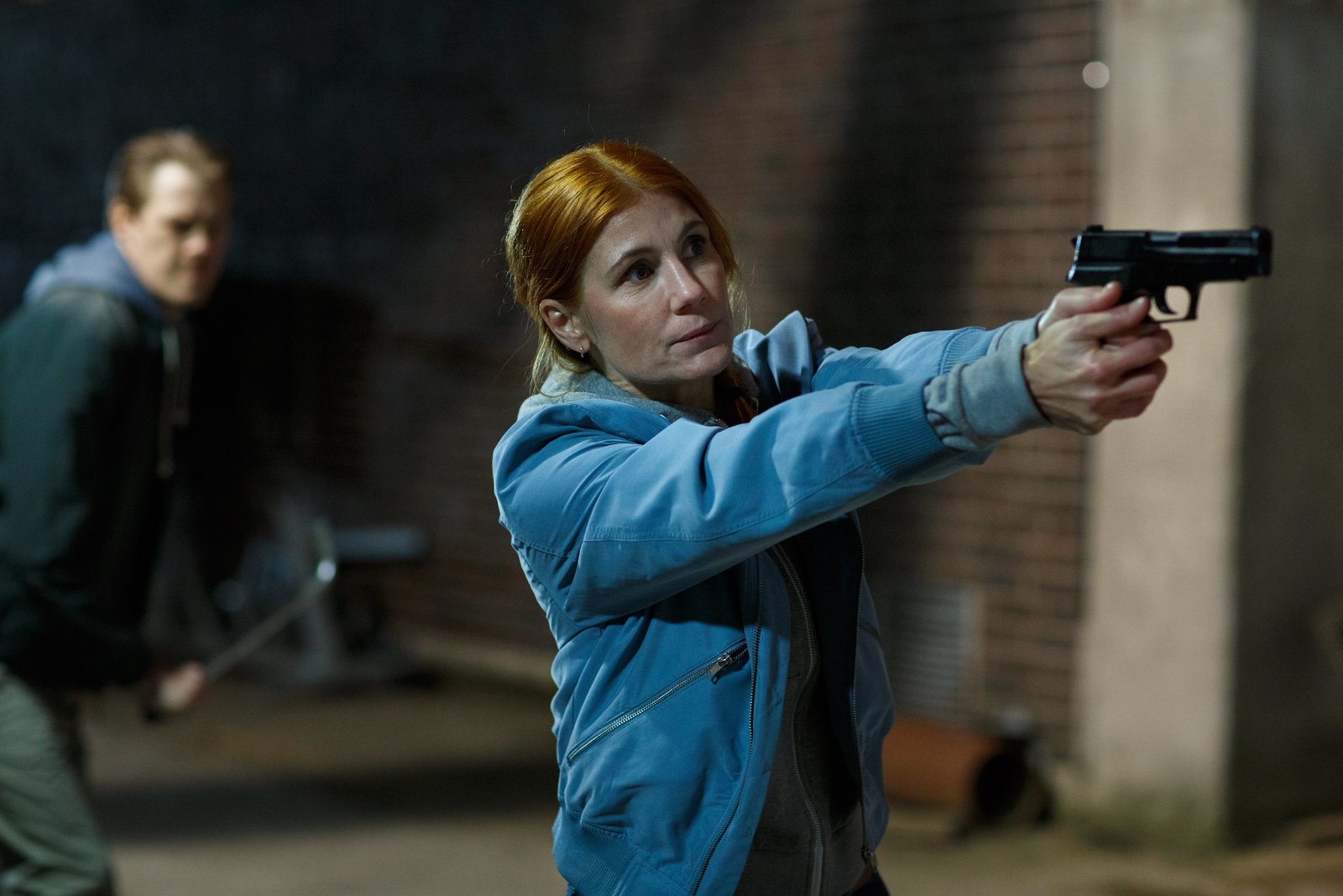 In guten wie in schlechten ZeitenMia (Sandra Andreis) hat Alkoholschmuggler auf frischer Tat ertappt. Die Gefahr ist aber noch nicht gebannt, als sich einer der Täter von hinten an sie heranschleicht.Bild: © ZDF und © Filmlance Int 2017 Photo: Johan Paulin.