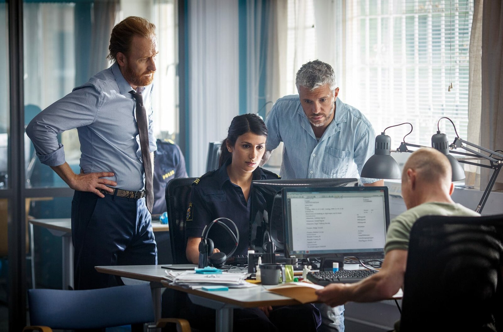 FamiliengeheimnisseAlexander Gullmar (Nicolai Cleve Broch, 2.v.r.) und seine Kollegin Miriam (Shirin Golchin, M.) berichten ihrem Chef Bengt-Olof Stenmark (Gustaf Hammarsten, l.) von den neuesten Ermittlungsergebnissen.Bild: © arte