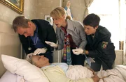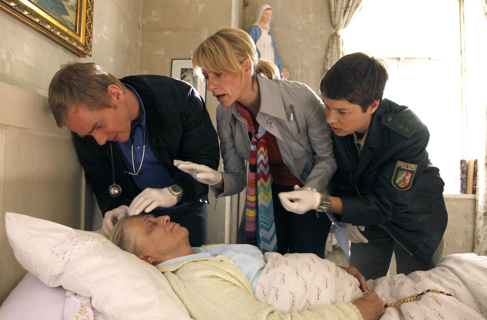 Blutende HerzenSophie Haas (Caroline Peters, M.) und Bärbel Schmied (Meike Droste, r.) haben darauf bestanden, dass Dr. Bechermann (Patrick Heyn, l.) die Leiche der angeblich sanft enschtschlafenen Oma Kathi (Maria Mägdefrau, liegend) ein zweites Mal untersucht und tatsächlich - er findet ein Loch in ihrem Kopf.Bild: © SWR/ARD/Frank Dicks