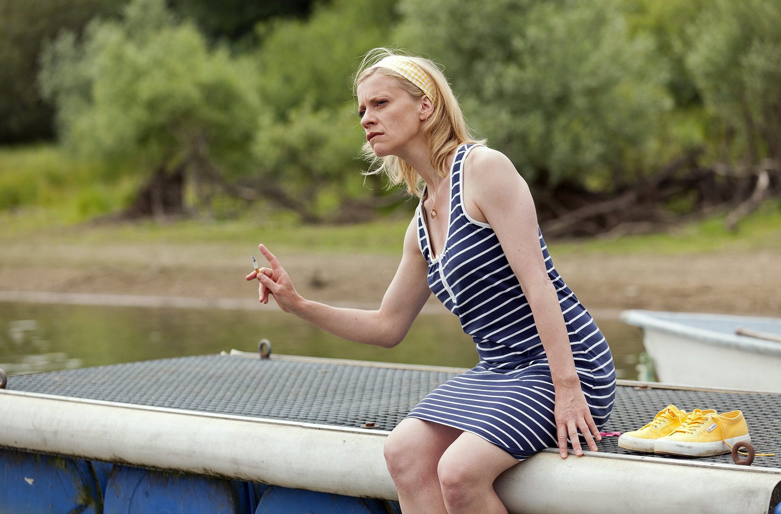 Das nennt man Campinghr-fernsehen MORD MIT AUSSICHT Folge 23, Das nennt man Camping, Fernsehserie, Deutschland 2008 - 2012, Regie: Christoph Schnee, am Donnerstag (17.10.13) um 21:45 Uhr. Sophie Haas (Caroline Peters) ermittelt undercover auf dem Campingplatz: sie lässt Schäffer nach einem Paket tauchen und raucht derweil auf dem Steg eine Zigarette.Bild: © HR/ARD/Frank Dicks