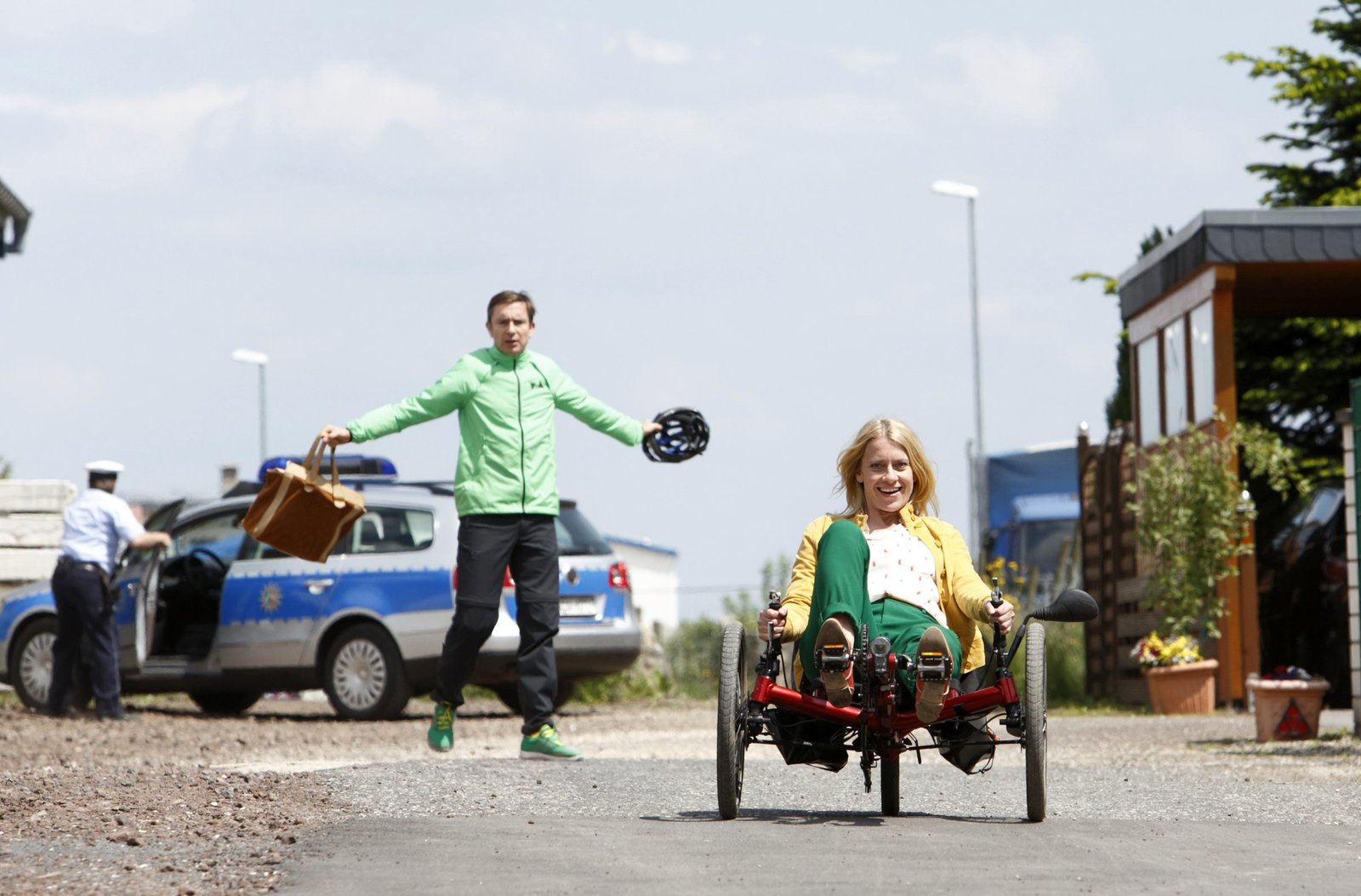 Der letzte VorhangSophie Haas (Caroline Peters, r.) nimmt mit dem Liegerad die Verfolgung auf, Dr. Kauth (Arnd Klawitter, l.) bleibt mit Fahrradhelm und Handtasche zurück.Bild: © WDR/ARD/Michael Böhme