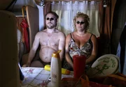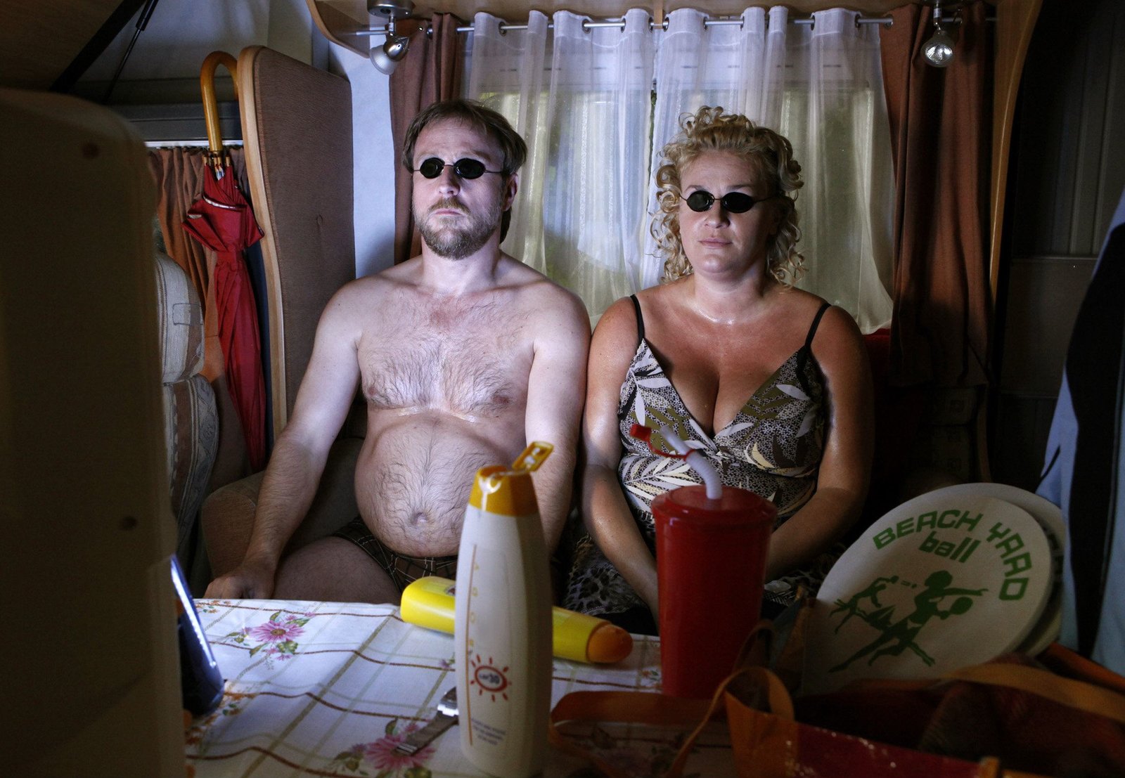 MikadoUrlaubsidylle bei Dauerregen: Dietmar Schäffer (Bjarne Mädel, l.) und seine Heike (Petra Kleinert) beim Sonnenbaden im Wohnmobil.Bild: © SWR/ARD/Frank Dicks