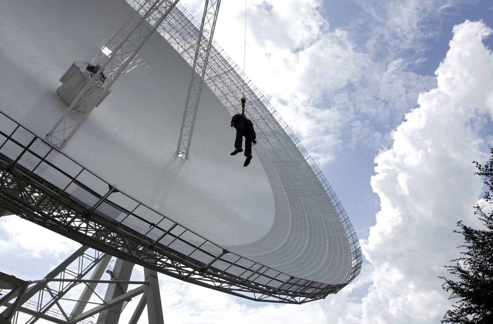 Sonne, Mord und SterneMitten in der riesigen Schüssel des Radioteleskops Zwiebelfeld baumelt die Leiche des Hamburger Astrophysikers Baade.Bild: © SWR/ARD/Frank Dicks
