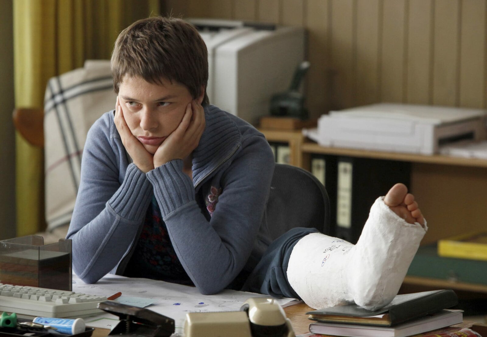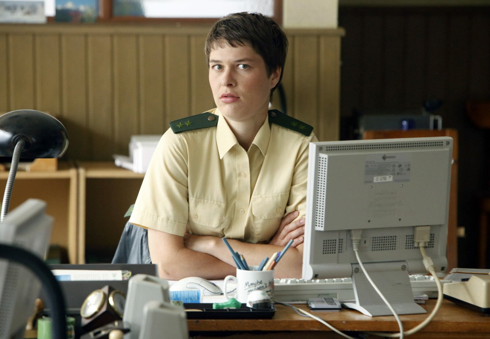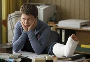 MikadoBärbel Schmied (Meike Droste) ist in einen Gully gefallen und hat sich das Bein gebrochen. Während Sophie Hass, die an allem schuld ist, auf Verbrecherjagd geht, muss Bärbel mit Gipsbein das Revier hüten.Bild: © SWR/ARD/Frank Dicks