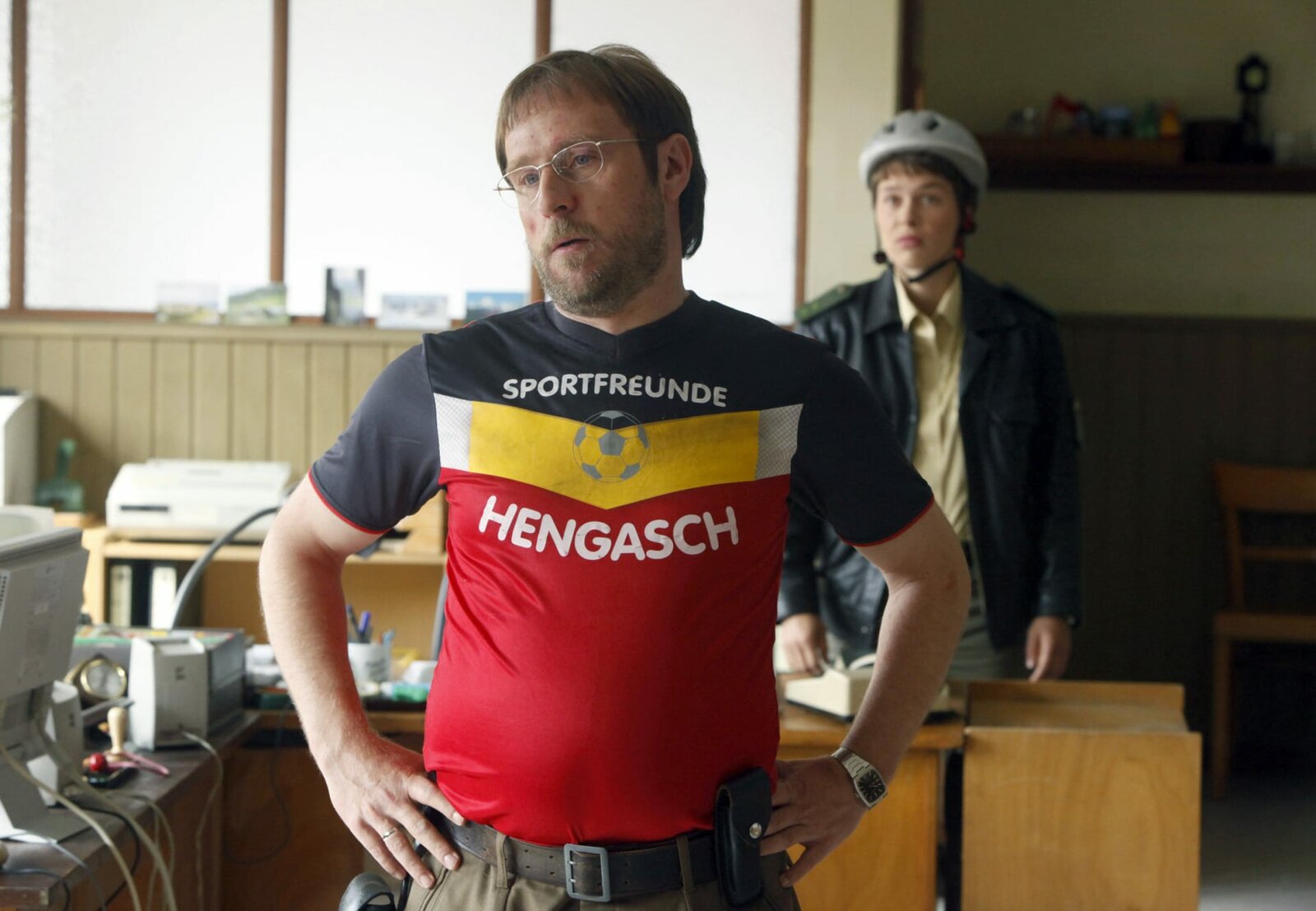 SpätleseDietmar Schäffer (Bjarne Mädel) gehts gar nicht gut: mit Pusteln im Gesicht und Fußballtrikot am Leib erscheint er zum Dienst. Heike hat aus Rache Dietmars Hemden versteckt - er hat den Hochzeitstag vergessen. Bärbel Schmied (Meike Droste, im HG) tuts echt leid.Bild: © rbb/ARD/Frank Dicks