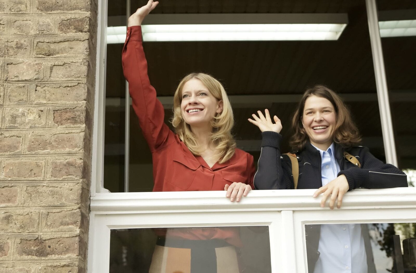 Sankt KennedyUnd tschüs - Sophie Haas (Caroline Peters, l.) und Bärbel Schmied (Meike Droste, r.) winken aus dem Fenster der Wache.Bild: © HR/ARD/Michael Böhme