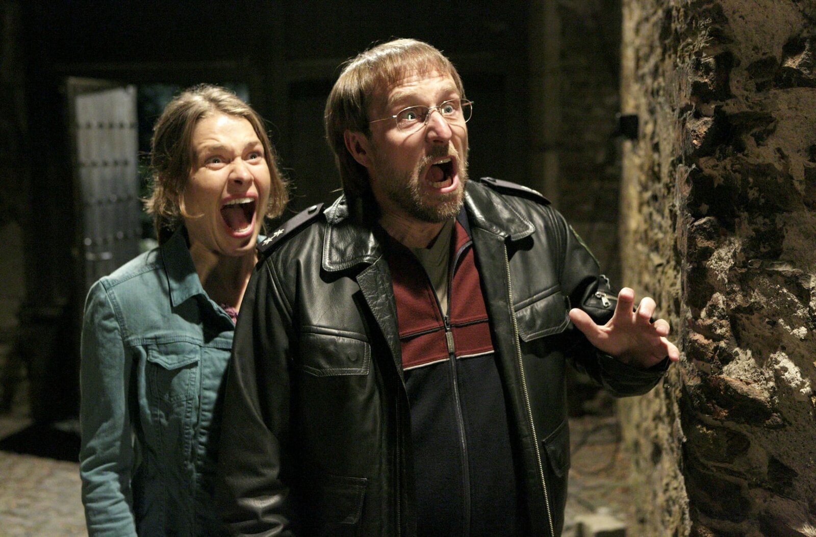 Spuk in Hengaschhr-fernsehen MORD MIT AUSSICHT (35), Spuk in Hengasch, Fernsehserie, Deutschland 2008 - 2014, am Montag (23.03.15) um 20:15 Uhr. Spuk in Hengasch - Dietmar Schäffer (Bjarne Mädel, r.) und Bärbel Schmied (Meike Droste, l.) haben vor Angst die Hosen voll.Bild: © ARD/BR/Michael Böhme