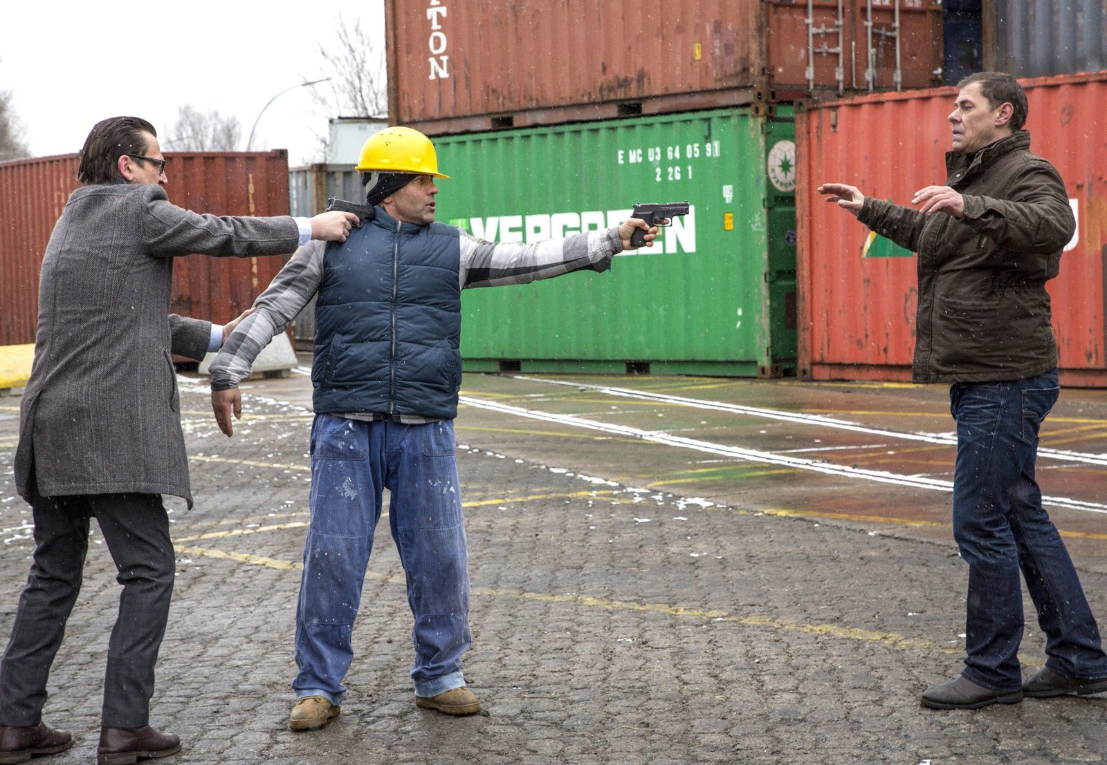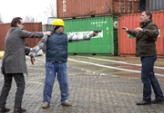 Tödliche UmleitungNDR Fernsehen HEITER BIS TÖDLICH: MORDEN IM NORDEN, "Tödliche Umleitung", am Donnerstag (28.05.15) um 23:30 Uhr. Sprengmeister Jan Schindler (Tim Wilde, M.) bedroht Finn Kiesewetter (Sven Martinek, r.) mit einer Waffe. Lars Englen (Ingo Naujoks, l.) versucht das Schlimmste zu verhindern.Bild: © NDR/ARD/Georges Pauly