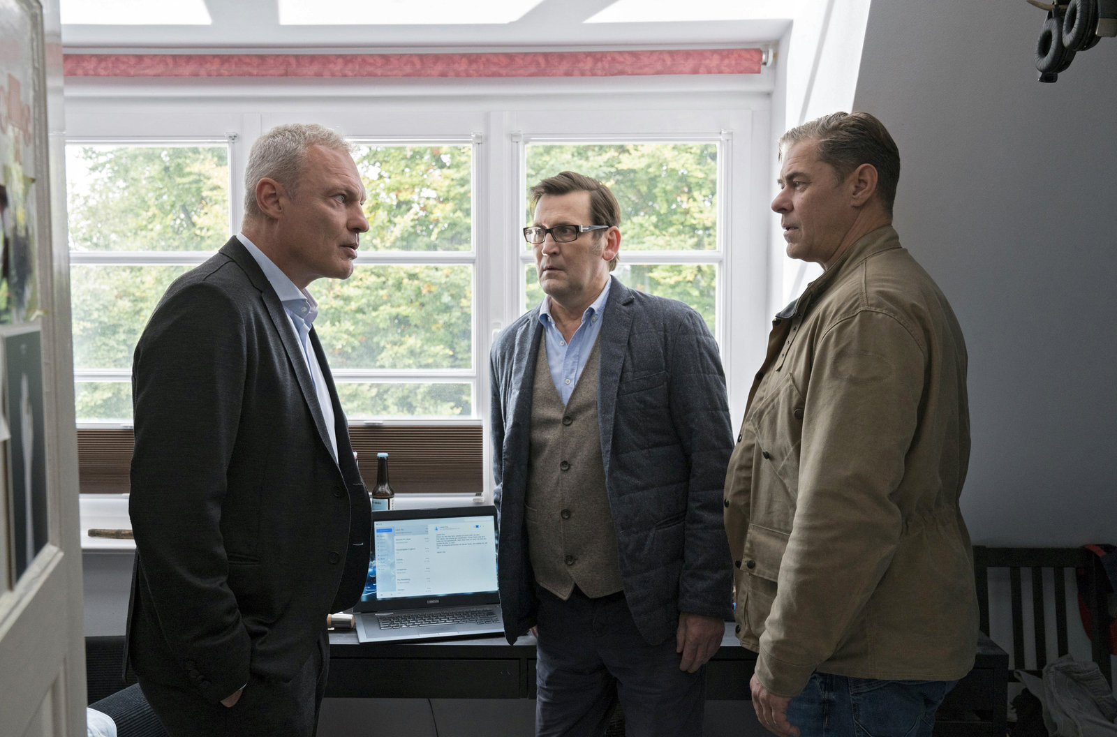 Schwarzer PeterLars (Ingo Naujoks, M.) und Finn (Sven Martinek, r.) konfrontieren den Lübecker Richter Harald Jahnke (Klaus Nierhoff, l.) damit, dass sein Sohn verdächtigt wird, einen Brand gelegt zu haben.Bild: © ARD/Georges Pauly