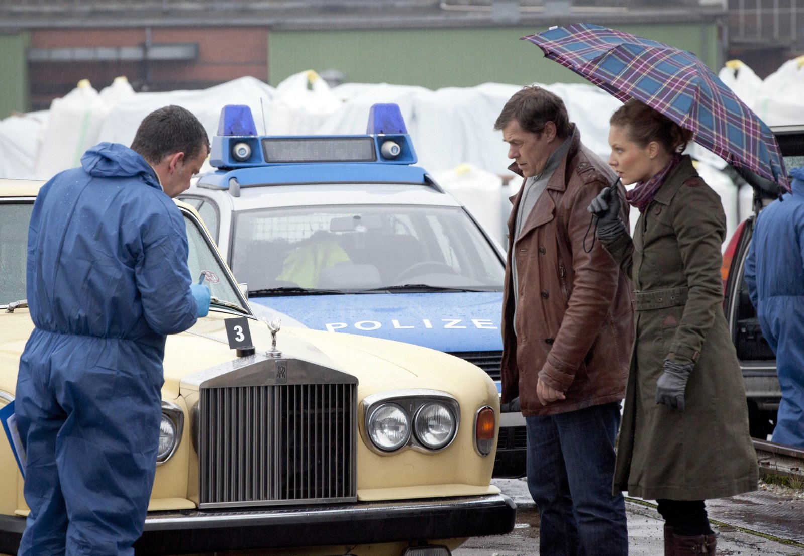 Tod eines ErbsenzählersARD HEITER BIS TÖDLICH - MORDEN IM NORDEN, neue Krimiserie am Vorabend mit 16 Folgen, Folge 14 "Tod eines Erbsenzählers" am Dienstag (29.05.12) um 18.30 Uhr im Ersten. Der Ordnungshüter Peter Zielinski wird am frühen Morgen in einer ruhigen Straße tot aufgefunden. Offensichtlich wurde er mit einem alten Rolls Royce überfahren. Ein Kollege von der Spurensicherung (Sebastian Faust, l.), Finn Kiesewetter (Sven Martinek, 2.v.r.) und Staatsanwältin Elke Rasmussen (Tessa Mittelstaedt, r.) am Tatort.Bild: © ARD/Georges Pauly