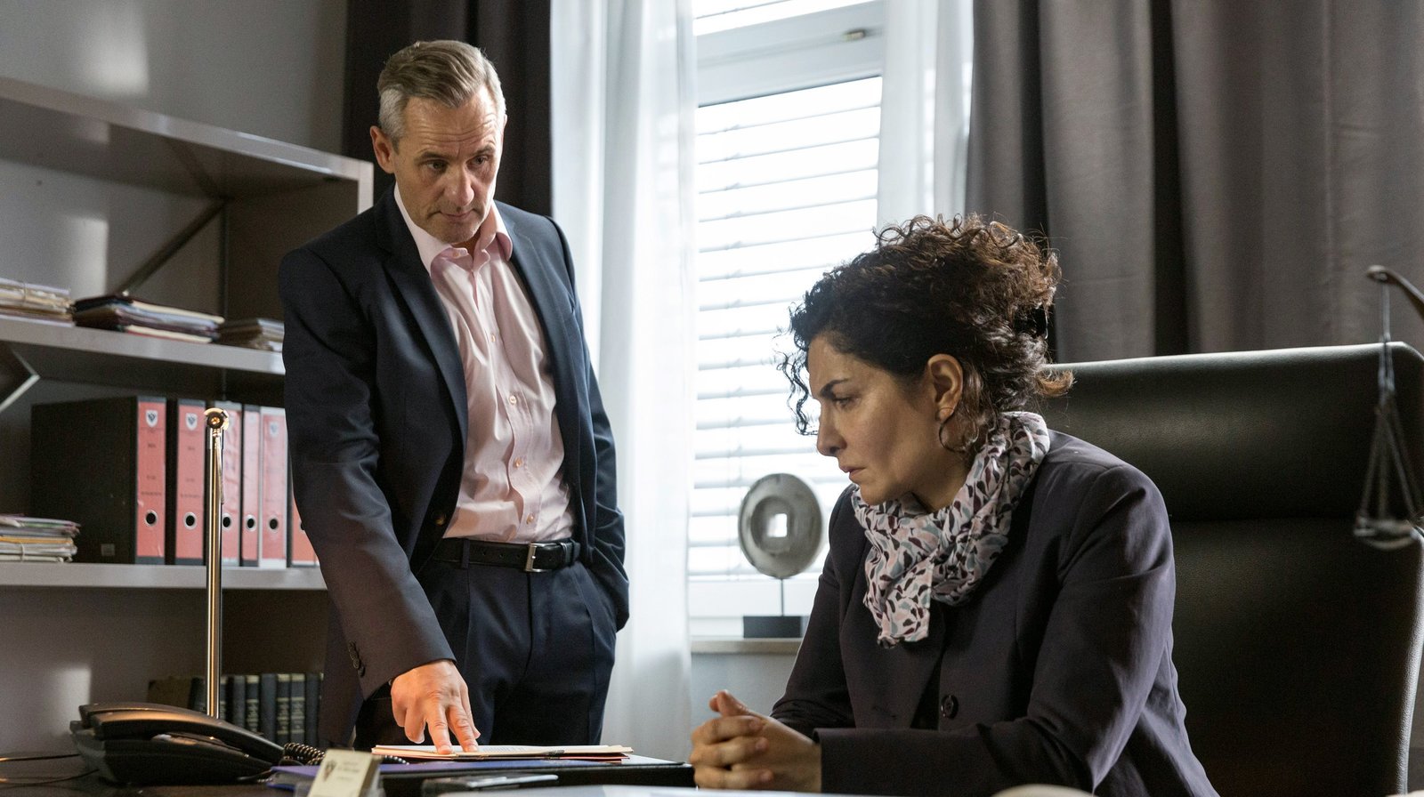FilmrissFür Oberstaatsanwalt Dr. Dane (Tim Wilde, l.) steht längst fest, dass die Staatsanwältin Dr. Zobel (Proschat Madani, r.) vollkommen betrunken den Fehler ihres Lebens begangen hat.Bild: © ARD/Georges Pauly