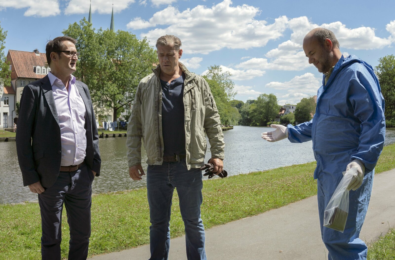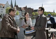 Heile FamilieBei einem Überfall in einem Lübecker Park wird Markus Henn, der mit seinem Pflegekind unterwegs war, schwer verletzt. Er fällt ins Koma. Lars Englen (Ingo Naujoks, l.), Finn Kiesewetter (Sven Martinek, M.) und Pathologe Dr. Henning Strahl (Christoph Tomanek,) nehmen die Ermittlungen auf.Bild: © ARD/Georges Pauly