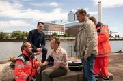 Über BordDie Besatzung eines Feuerwehrschiffs (Komparsen) hat einen Toten aus dem Wasser gezogen. Pathologe Dr. Strahl (Christoph Tomanek, r.) erklärt Finn (Sven Martinek, M.) und Elke Rasmussen (Tessa Mittelstaedt, l.), dass es kein Unfall war, sondern dass es sich um Mord handelt: an einem Sicherungsseil wurde manipuliert.Bild: © SWR/ARD/Georges Pauly