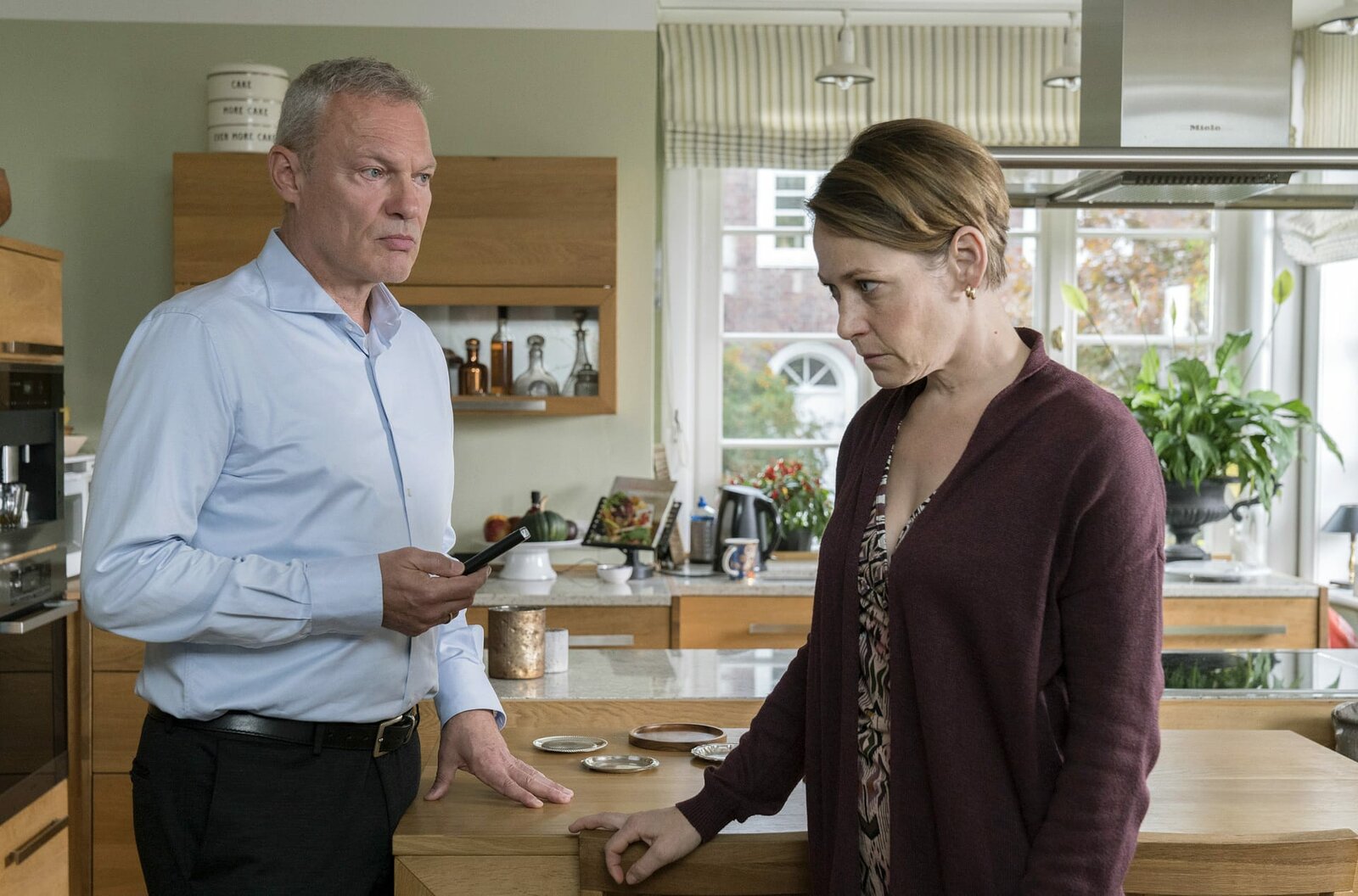 Schwarzer PeterHarald Jahnke (Klaus Nierhoff, l.) macht seiner Frau Dagmar (Stephanie Japp, r.) Vorwürfe.Bild: © ARD/Georges Pauly