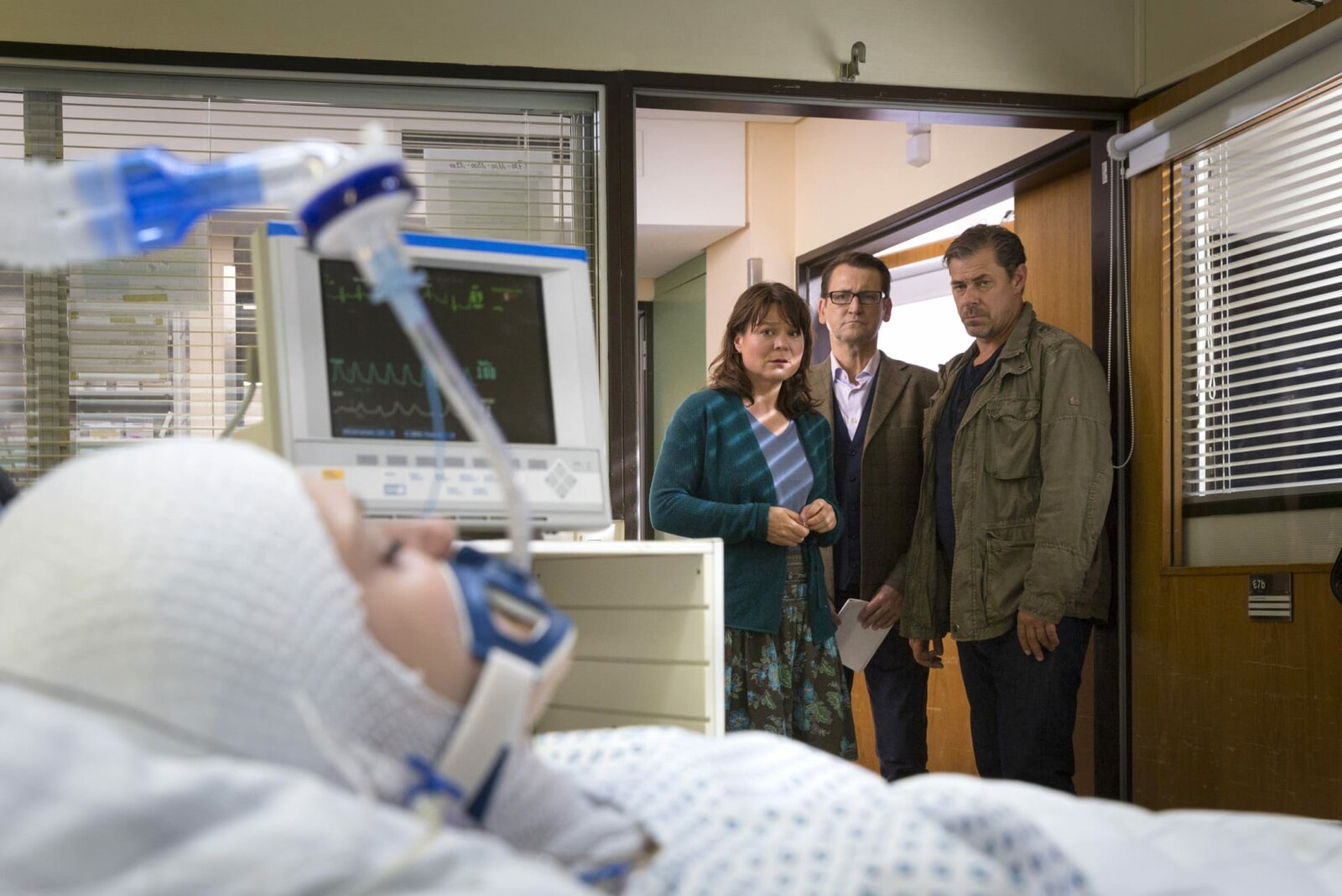 AusgespieltDie 18-jährige Geigerin Paula wird an einem Bahnhof brutal überfallen und auf die Gleise gestoßen. Schwerverletzt liegt sie im Krankenhaus. V.l.n.r. Paula Blanck (Caroline Hartig), Paulas Mutter (Julia Schmidt), Lars Englen (Ingo Naujoks), Finn Kiesewetter (Sven Martinek).Bild: © MDR/ARD/Georges Pauly