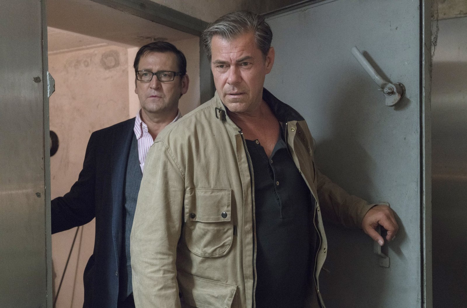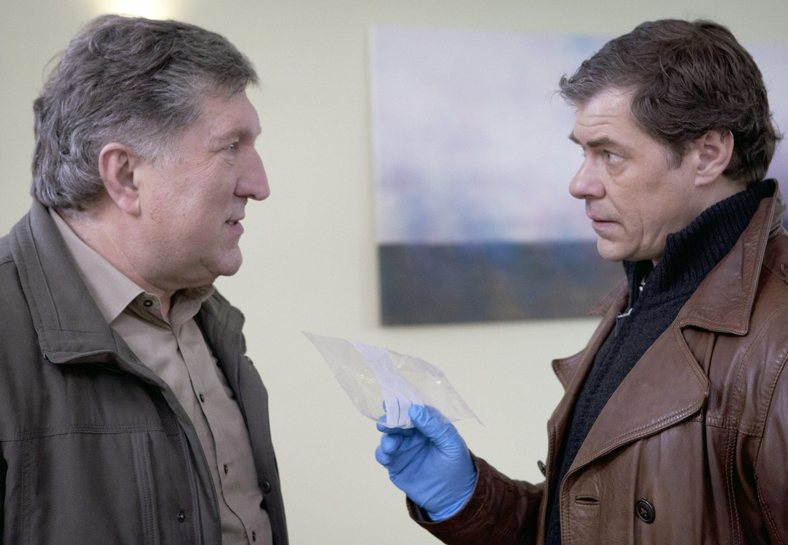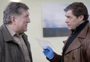 Ein Sarg für zweiEin kurioser Leichenfund im Bestattungsinstitut "Sanfte Ruh" beschäftigt die Belegschaft im Lübecker Kommissariat. Die Ermittlungen gehen in alle Richtungen. Finn Kiesewetter (Sven Martinek, r.) mit Schroeter (Veit Stübner, l.)Bild: © ARD/Georges Pauly