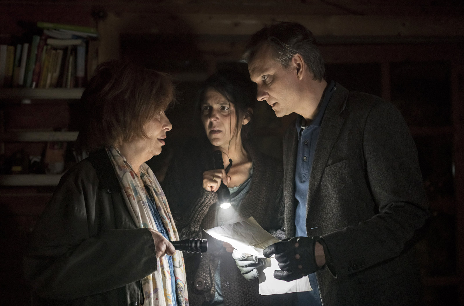 AngstJana Overbeck (Katinka Auberger, M.) trifft sich mit Sigrid Grothius (Teresa Harder, l.) und deren Sohn Klaus (Sebastian Weber , r.).Bild: © ARD/Georges Pauly