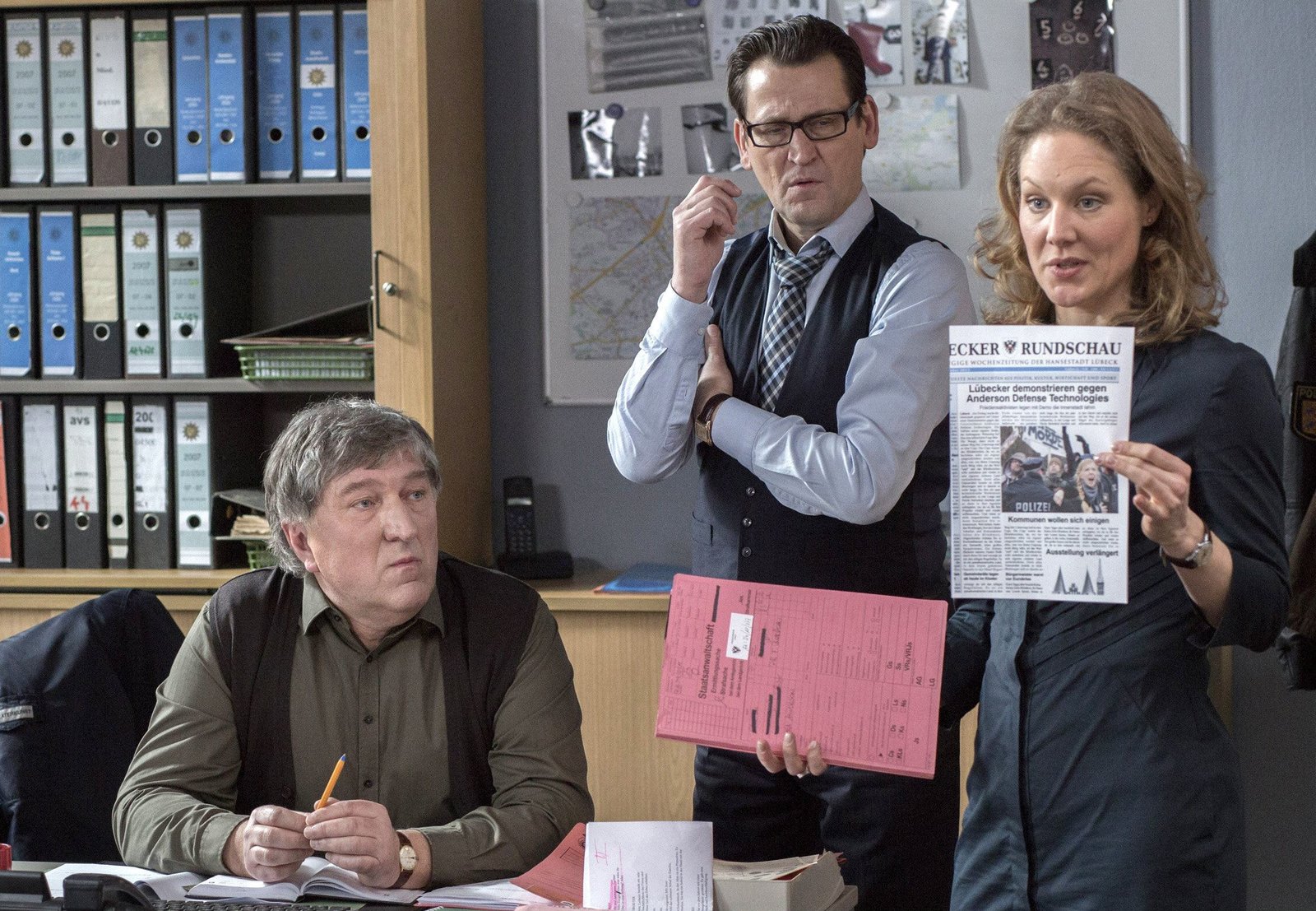 Tödliche UmleitungNDR Fernsehen HEITER BIS TÖDLICH: MORDEN IM NORDEN, "Tödliche Umleitung", am Donnerstag (28.05.15) um 23:30 Uhr. Elke Rasmussen (Tessa Mittelstaedt, r.) zeigt den Kollegen, Lars Englen (Ingo Naujoks, M.) und Schröter (Veit Stübner, l.) einen Zeitungsartikel über die Demos gegen Andersons Waffenfabrik.Bild: © NDR/ARD/Georges Pauly