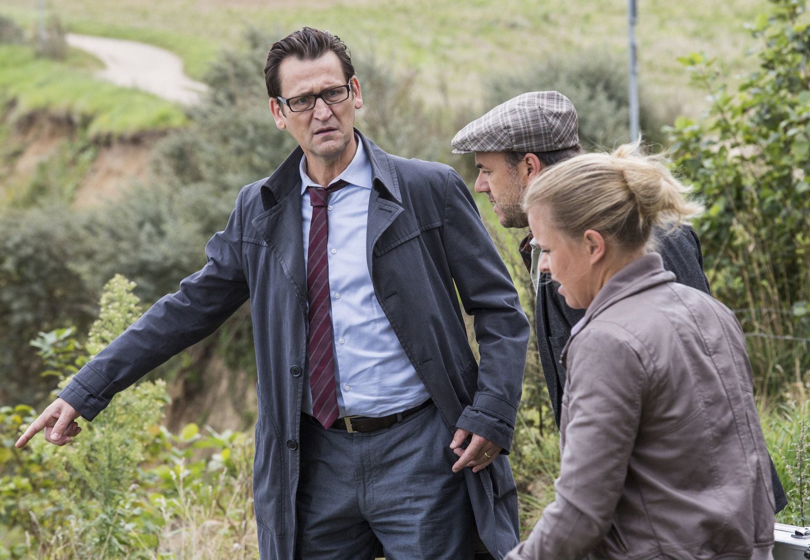 Auf der KlippeMDR Fernsehen MORDEN IM NORDEN FOLGE 17, "Auf der Klippe", am Montag (04.05.15) um 22:50 Uhr. Ein Toter an der Steilklippe. Kriminaldirektor Lars Englen (Ingo Naujoks, l.), Pathologe Dr. Strahl (Christoph Tomanek, M.) und Sandra Schwartenbeck (Marie-Luise Schramm, r.) am Tatort.Bild: © MDR/Georges Pauly