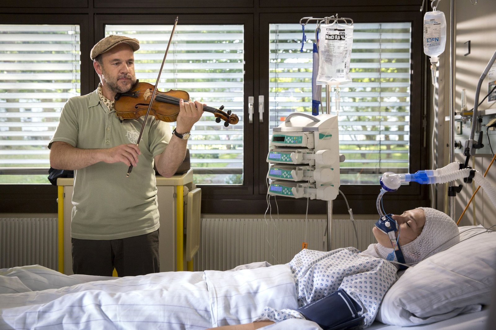 AusgespieltDie 18-jährige Geigerin Paula (Caroline Hartig, r.) wird an einem Bahnhof brutal überfallen und auf die Gleise gestoßen. Schwerverletzt liegt sie im Krankenhaus. Der Pathologe Strahl (Christoph Tomanek, l.) spielt für sie auf der Geige.Bild: © ARD/Georges Pauly