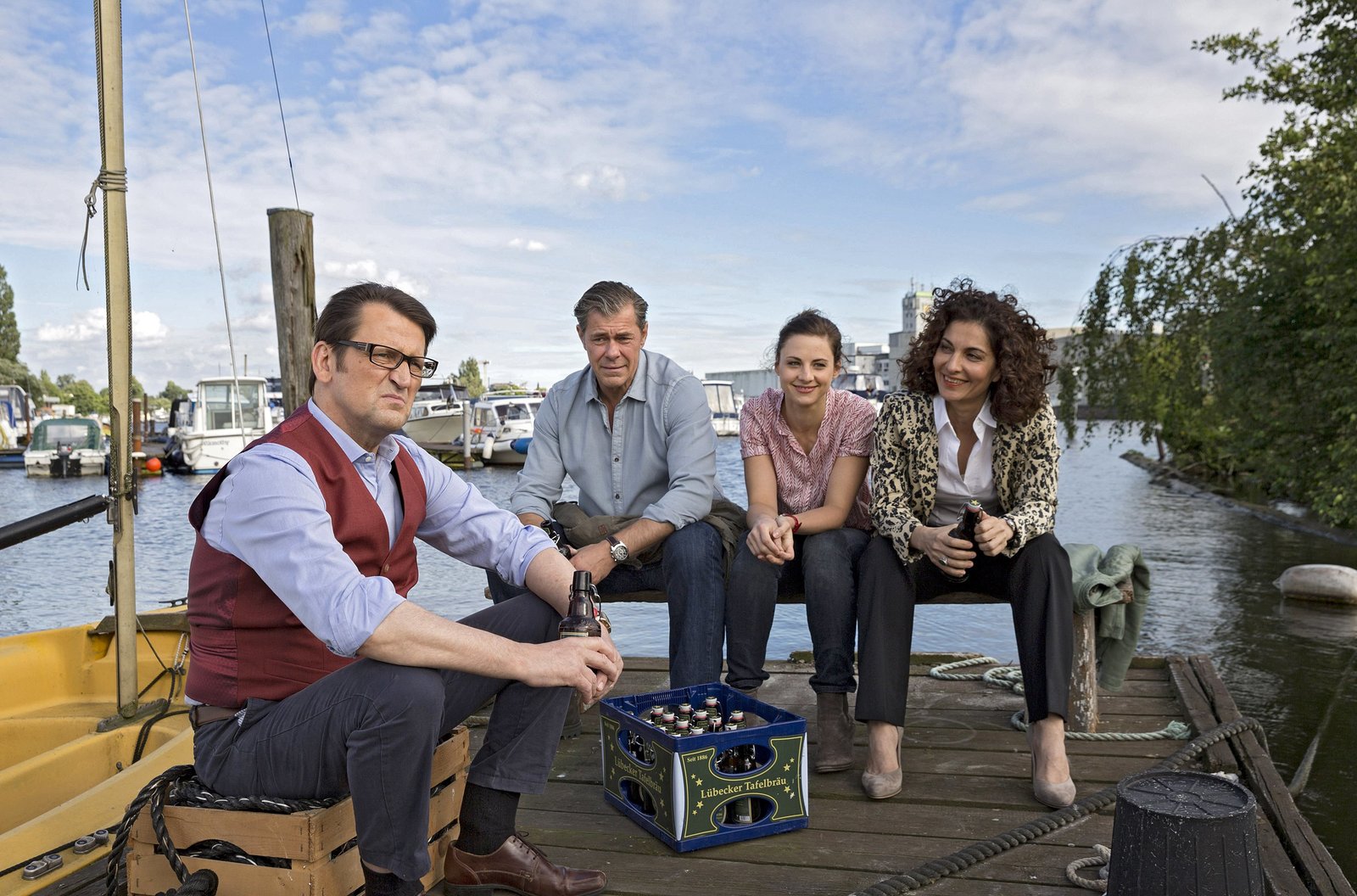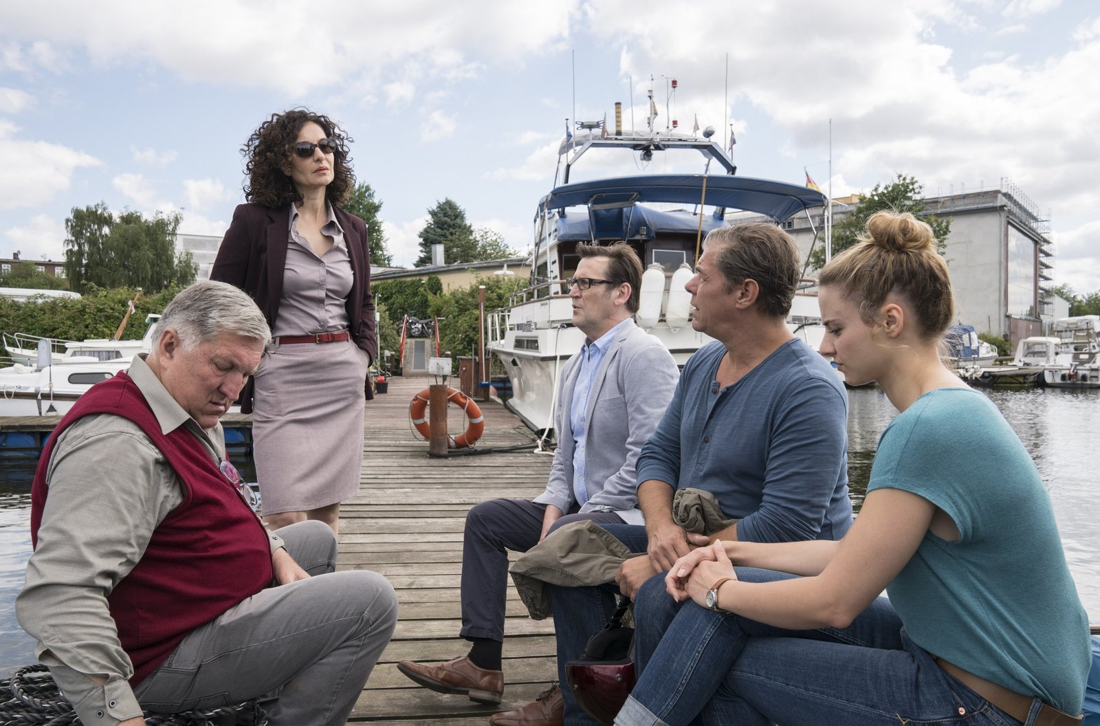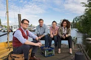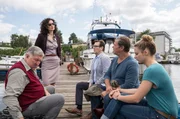 AschenputtelStrahl (Christoph Tomanek, l.) erklärt Finn (Sven Martinek, 2.v.l.), Lars (Ingo Naujoks, 2.v.r.) und Nina (Julia Schäfle, r.), dass das Opfer vermutlich durch einen Fußtritt von einem Boot gestoßen wurde.Bild: © ARD/Georges Pauly