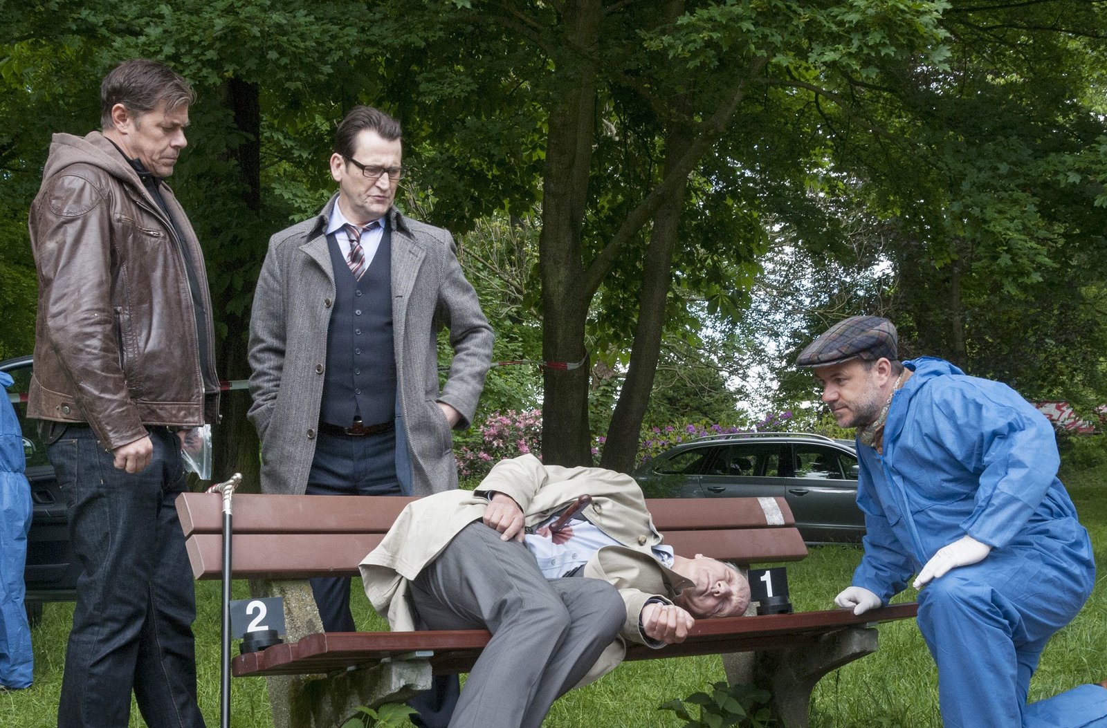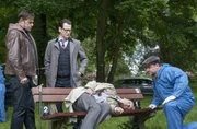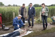 Der Nackte und der ToteGerichtsmediziner Dr. Strahl (Christoph Tomanek, r.) und die Kommissare Finn Kiesewetter (Sven Martinek, l.) und Lars Englen (Ingo Naujoks, 2.v.l.) am Tatort mit Lasse Hellgards (Thomas Bestvater, liegend) Leiche.Bild: © ARD/Georges Pauly