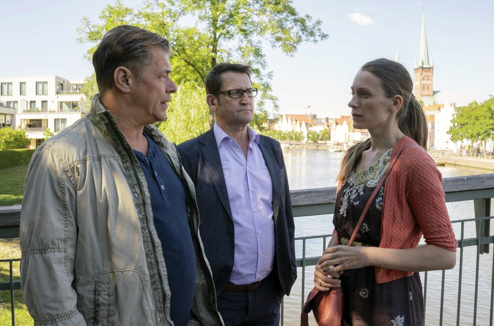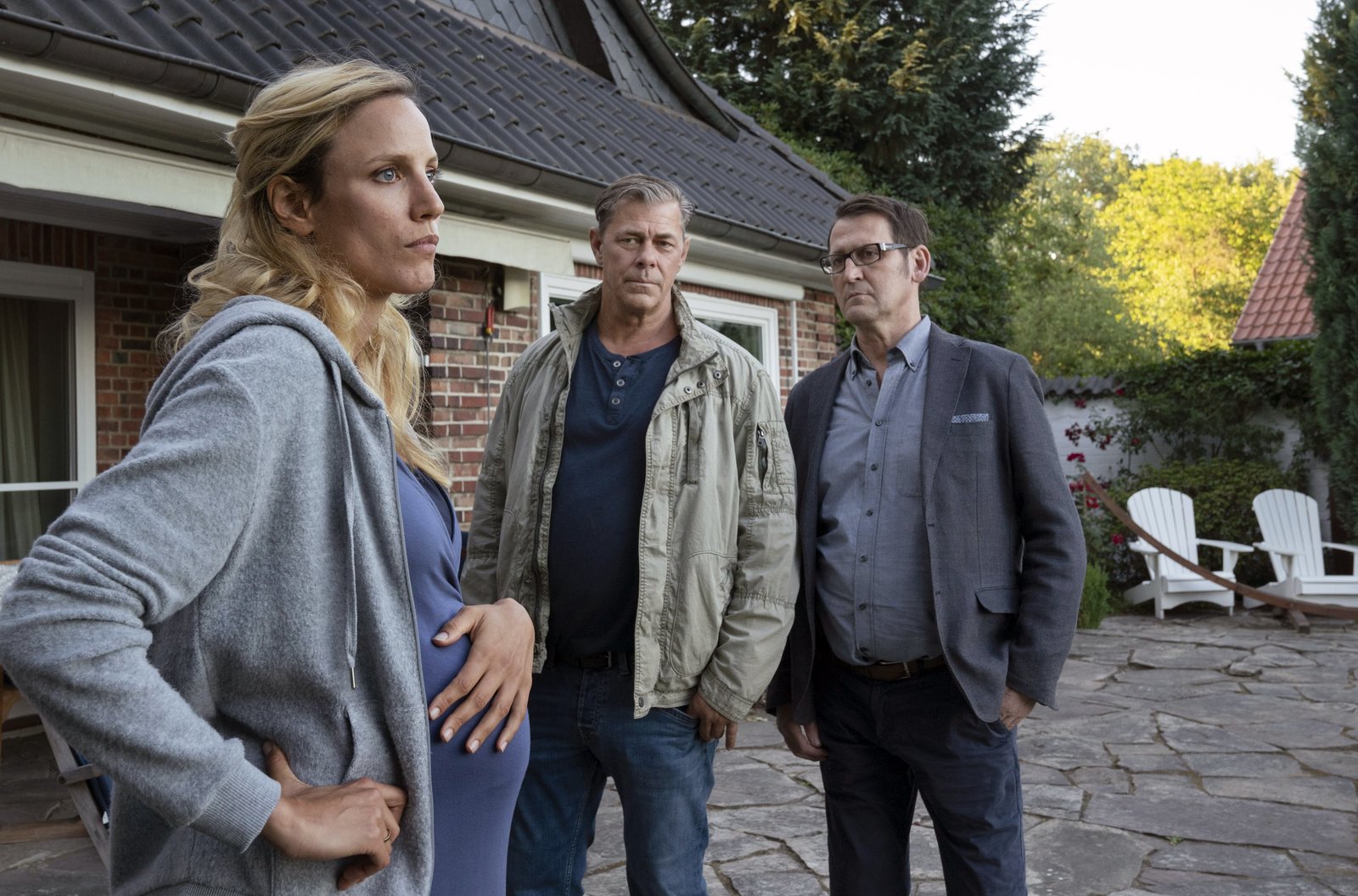 Alexander Hoffmann, ein Ex-Trinker, wurde in seinem Haus am Wasser niedergestochen und tödlich verletzt. Die Lübecker Ermittler Finn (Sven Martinek, M.), Lars (Ingo Naujoks, r.) befragen Sabine Ahlgrimm (Isabel Thierauch, l.). In welcher Verbindung stand sie zu dem Toten.Bild: © ARD/Georges Pauly