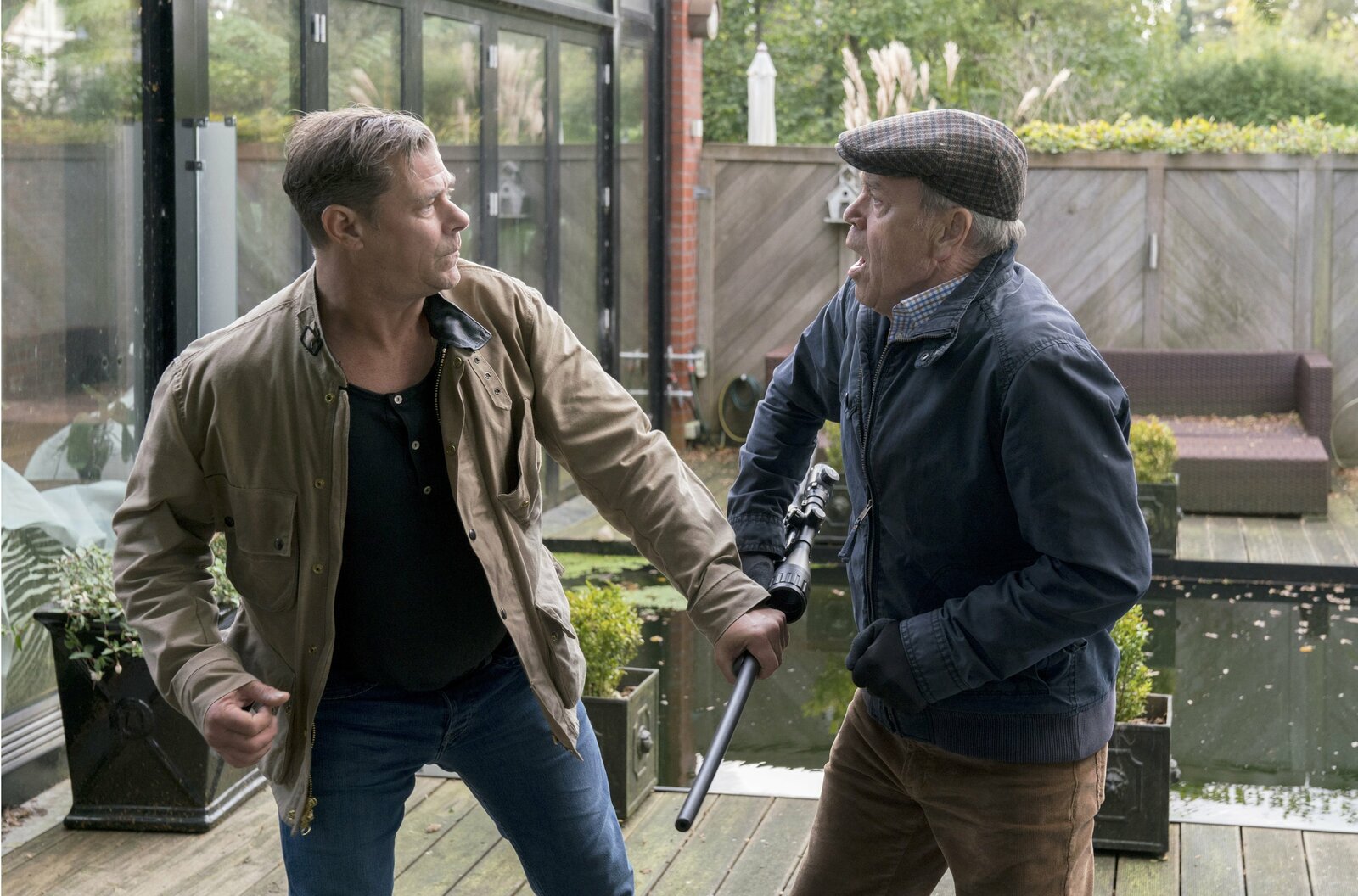 Jäger und SammlerFinn (Sven Martinek, l.) schlägt Michael Vogt (Jürgen Heinrich, r.) das Gewehr aus der Hand.Bild: © SWR/ARD/Georges Pauly