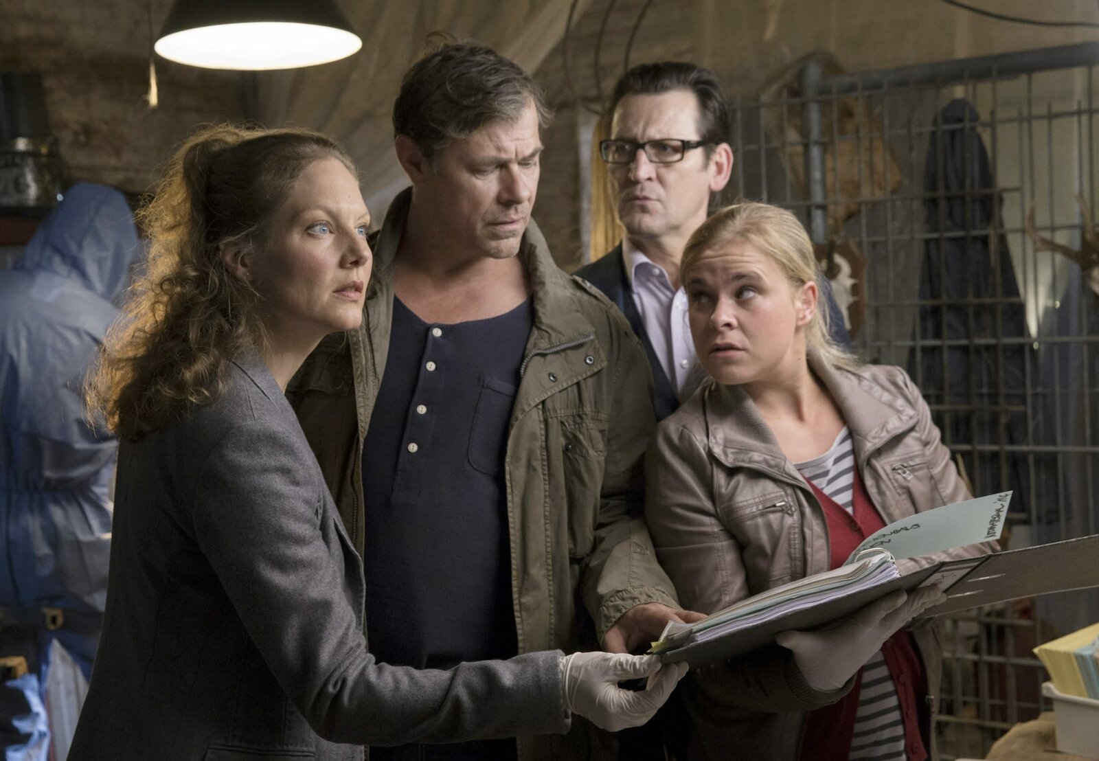 Ein Sarg für zweiMDR Fernsehen MORDEN IM NORDEN FOLGE 15, "Ein Sarg für zwei", am Dienstag (28.10.14) um 00:00 Uhr. Ein kurioser Leichenfund im Bestattungsinstitut "Sanfte Ruh" beschäftigt die Belegschaft im Lübecker Kommissariat: V.l.n.r. Kriminalhauptkommissar Schroeter (Veit Stübner), Kriminaldirektor Lars Englen (Ingo Naujoks), Staatsanwältin Elke Rasmussen (Tessa Mittelstaedt), Kriminalhauptkommissar Finn Kiesewetter (Sven Martinek).Bild: © MDR/Georges Pauly