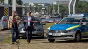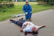 Am LimitEin Geldtransporter wurde brutal überfallen. Der Fahrer Pawel Olkowski (Tom Keune, r.) ist dabei ums Leben gekommen. Pathologe Dr. Strahl (Christoph Tomanek, l.) stellt Untersuchungen am Tatort an.Bild: © MDR/ARD/Georges Pauly