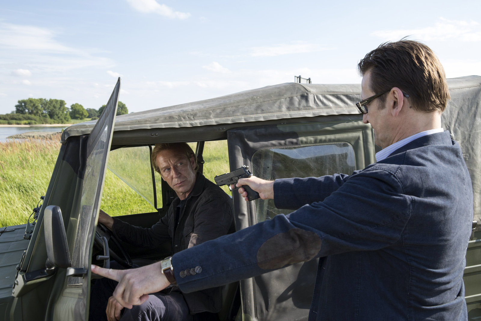 AusgeblutetKriminaldirektor Lars Englen (Ingo Naujoks, r.) stellt Alexander Voss (Oliver Stritzel, l.).Bild: © ARD/Georges Pauly