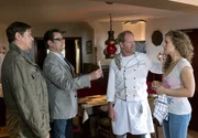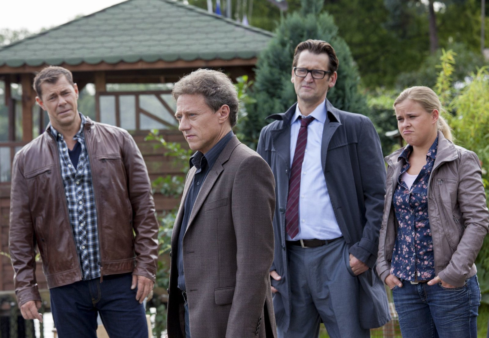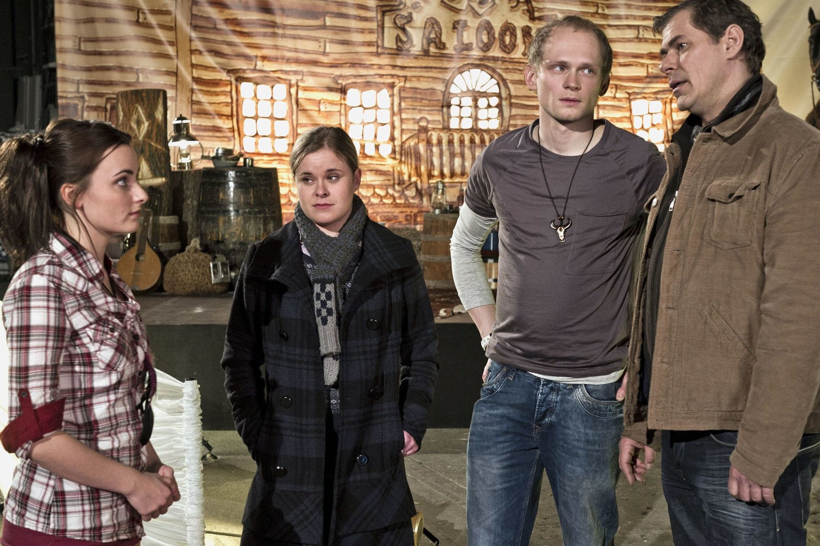 AusgekochtLars Englen (Ingo Naujoks, 2.v.l.) und Finn Kiesewetter (Sven Martinek, l.) befragen Gasthofbesitzer Martin Quade (Guntbert Warns, 2.v.r.) und dessen Freundin Anke Maas (Alessija Lause, r.).Bild: © WDR/ARD/Georges Pauly