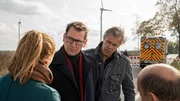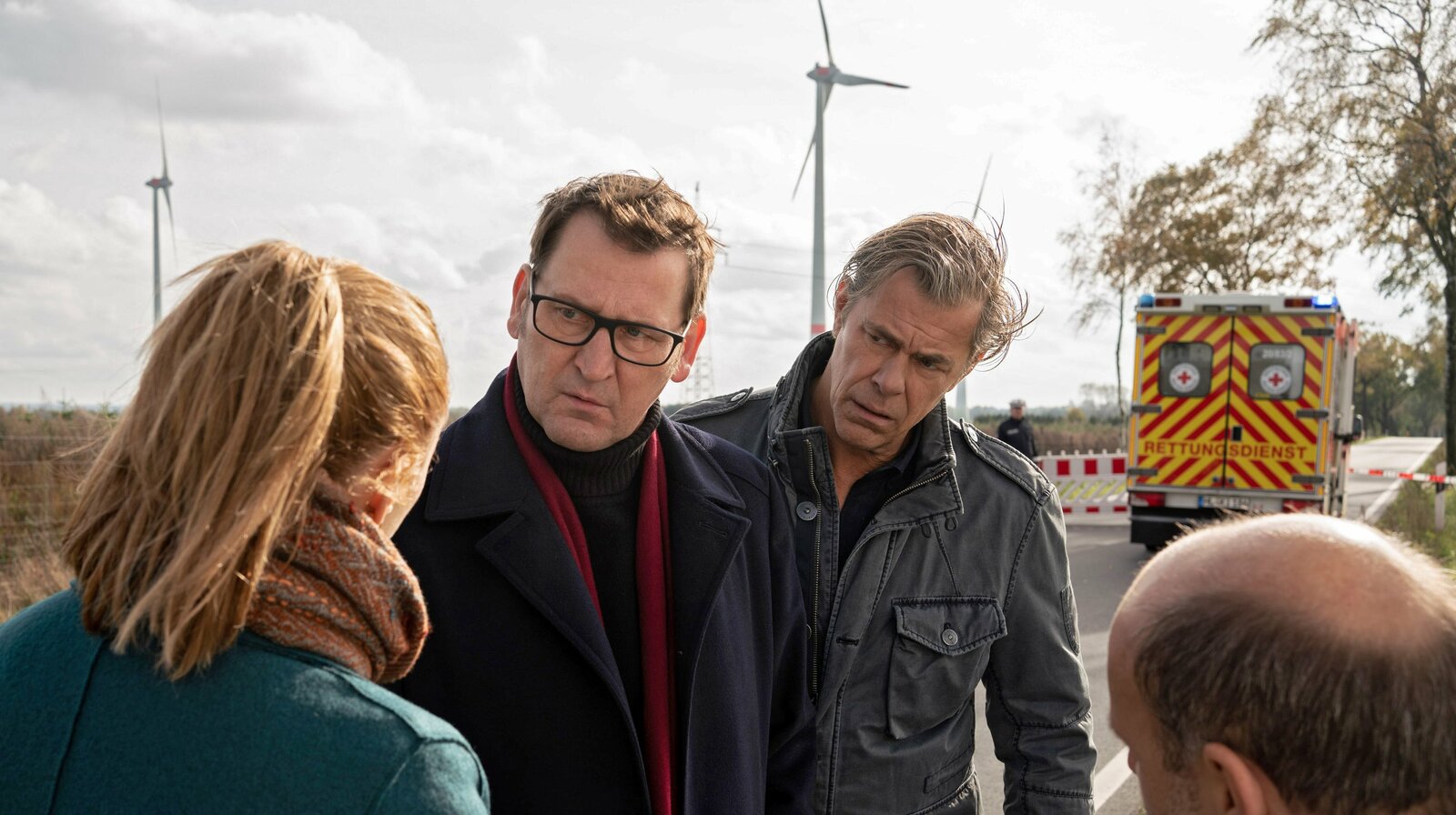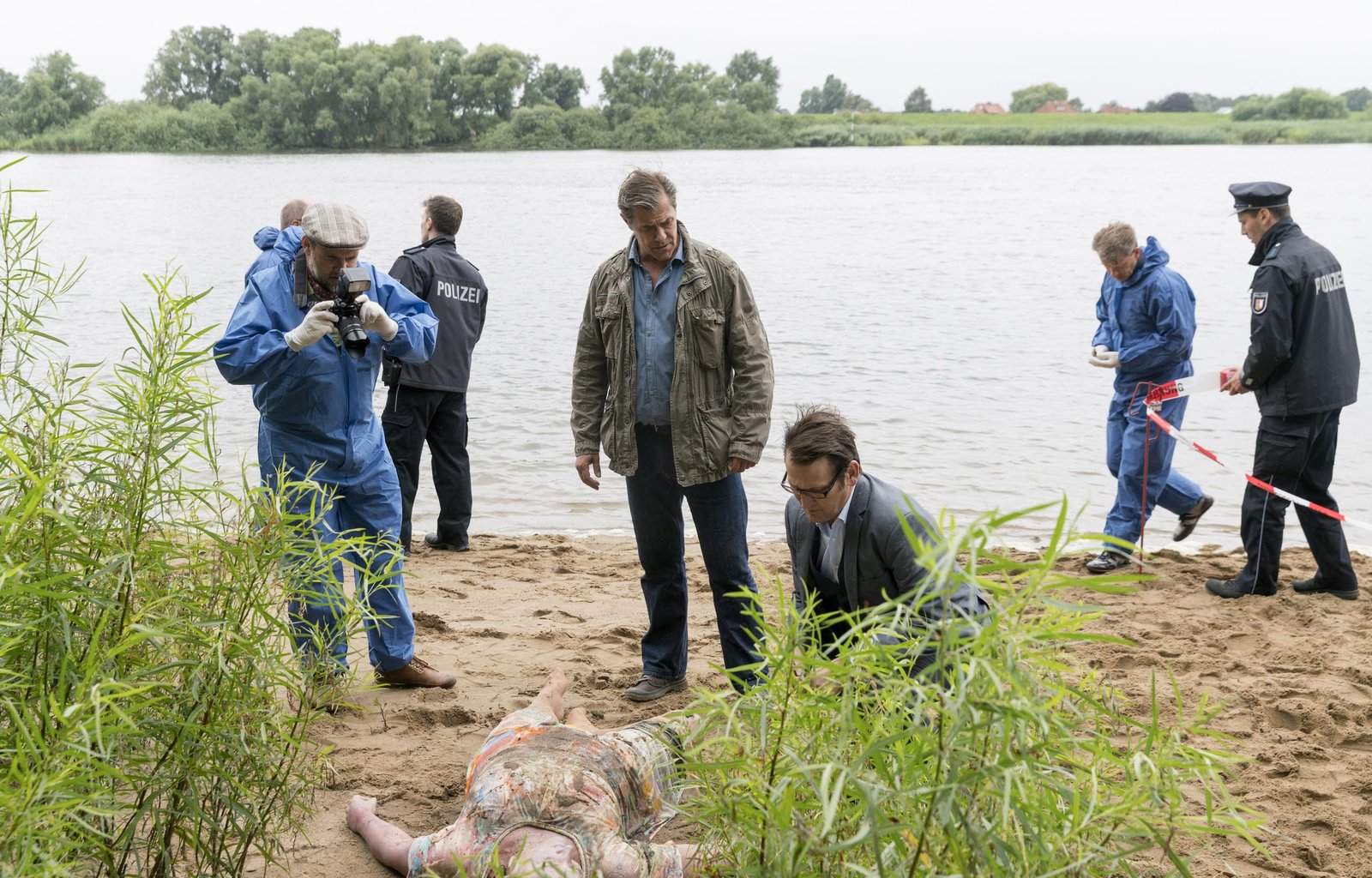 Reine GeldgierStrahl (Christoph Tomanek, l.), Finn (Sven Martinek, M.) und Lars (Ingo Naujoks, 3.v.r. mit Komparsen) schauen sich am Fundort der Leiche um.Bild: © ARD/Georges Pauly