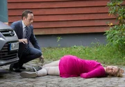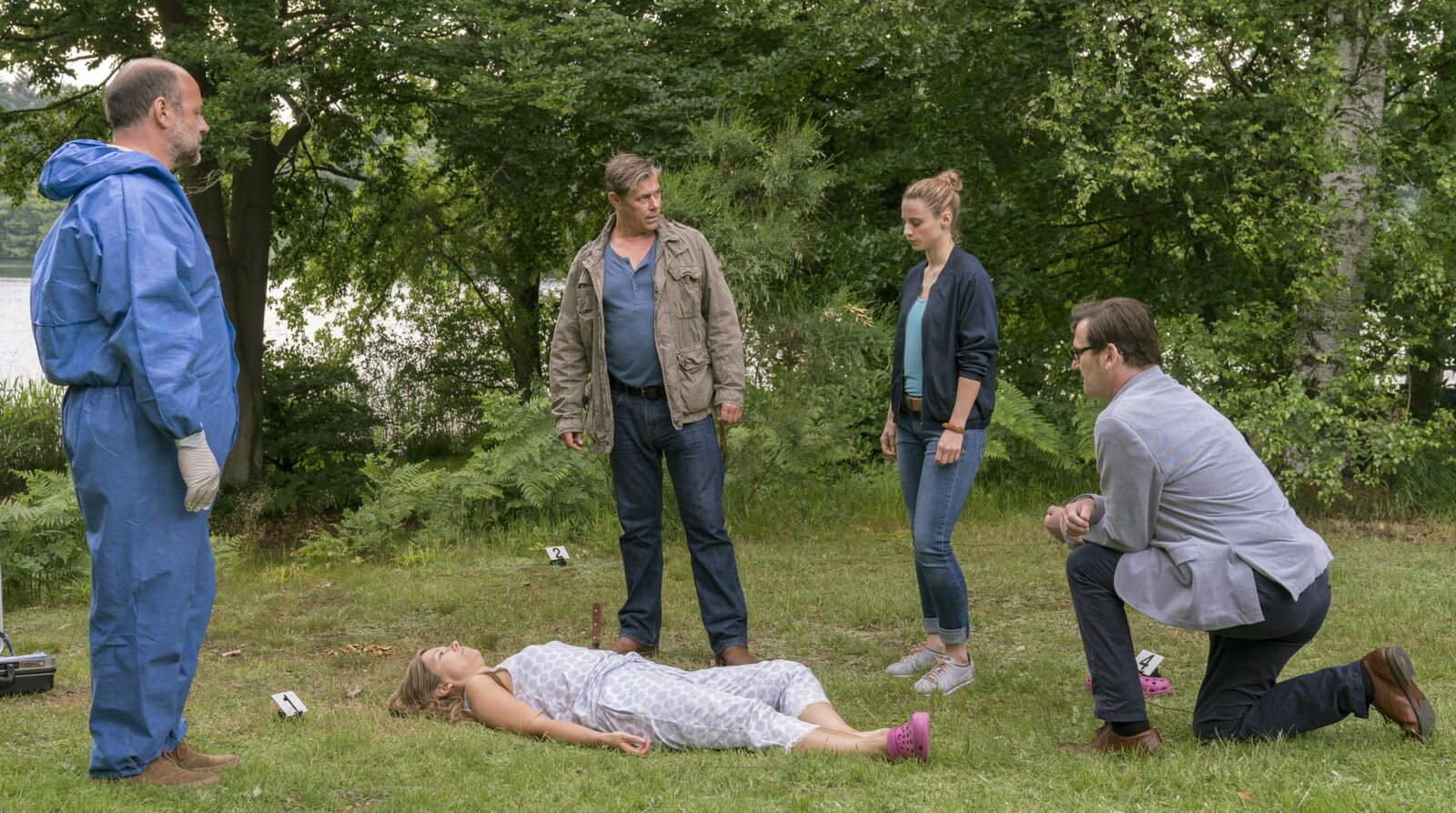 LiebesblindEva Herzog wird von ihrem Ehemann mit einem Messer in der Brust im Garten gefunden. V.l.n.r. Der Pathologe Dr. Strahl (Christoph Tomanek), Finn Kiesewetter (Sven Martinek), Nina Weiss (Julia Schäfle) und Lars Englen (Ingo Naujoks) stehen vor einem rätselhaften Fall.Bild: © ARD/Georges Pauly
