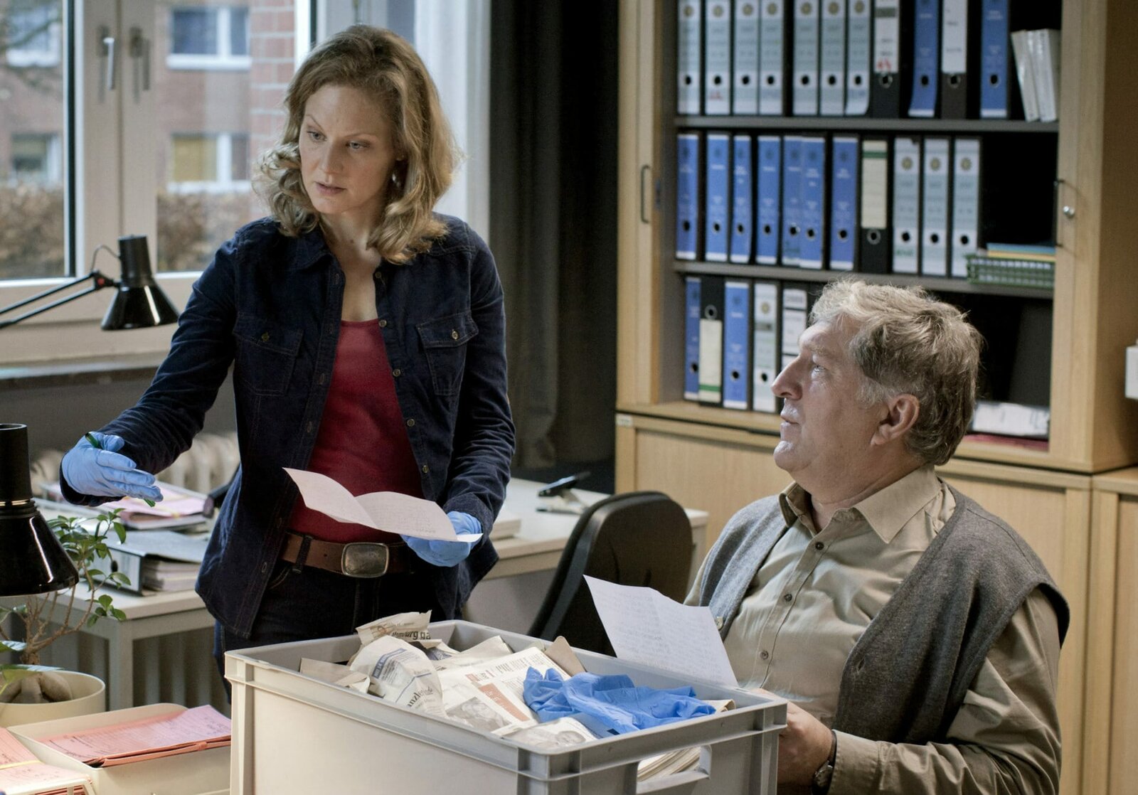 Die NagelprobeSchroeter (Veit Stübner, r.) und Staatsanwältin Elke Rasmussen (Tessa Mittelstaedt, l.) werten Beweismittel aus.Bild: © MDR/Georges Pauly