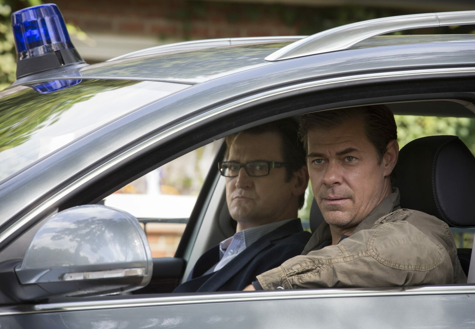Tödliche BeobachtungDie Kriminalkommissare Finn Kiesewetter (Sven Martinek, r.) und Lars Englen (Ingo Naujoks, l.) observieren den Verdächtigen Herbert Müller.Bild: © WDR/ARD/Georges Pauly