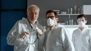 Perfides SpielProf. Grothmann (Frieder Venus, l.) und Lars Englen (Ingo Naujoks, 2.v.r.) versuchen mit allen Mitteln, das gefährliche Gerangel mitten im Labor zu stoppen (mit Dennis Schigiol, r.).Bild: © ARD/Christine Schröder