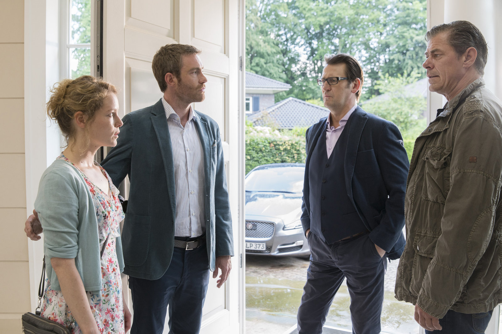 AschenputtelFür Lars (Ingo Naujoks, 2.v.r.) und Finn (Sven Martinek, r.) steht schnell Moritz von Dornhain (Max Engelke, 2.v.l.), Suse Hausmanns (Angelina Häntsch, l.) Verlobter, unter Verdacht.Bild: © ARD/Georges Pauly