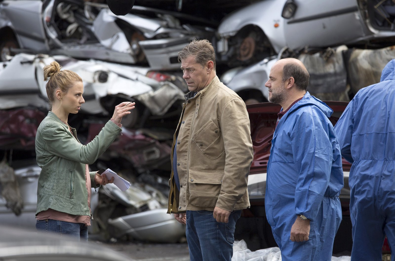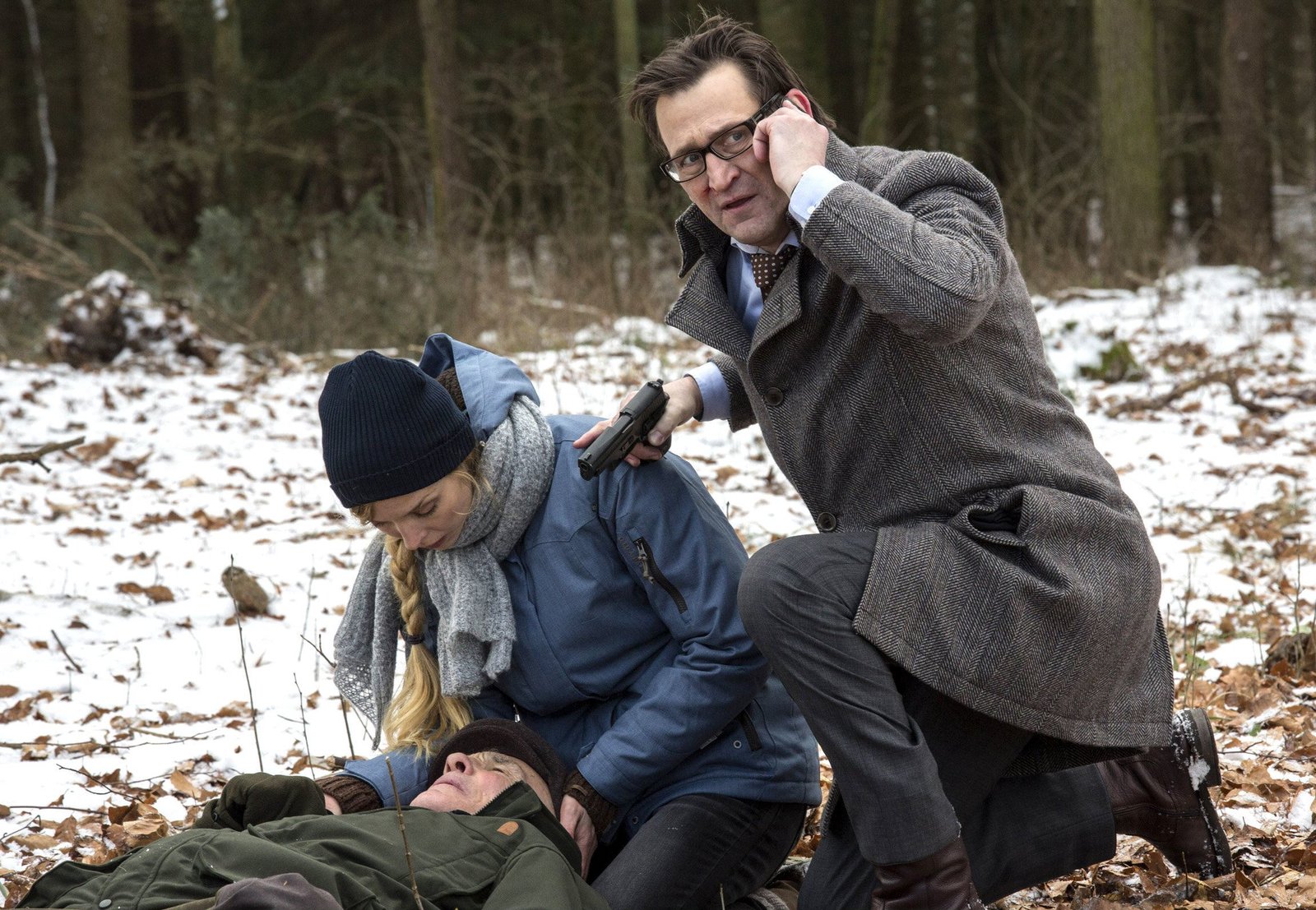 Tödliche UmleitungClara Anderson (Pheline Roggan, l.) kommt ihrem angeschossenen Vater Gerhard Anderson (Hans Peter Hallwachs, liegend) zu Hilfe. Lars Englen (Ingo Naujoks, r.) informiert den Notarzt.Bild: © MDR/Georges Pauly