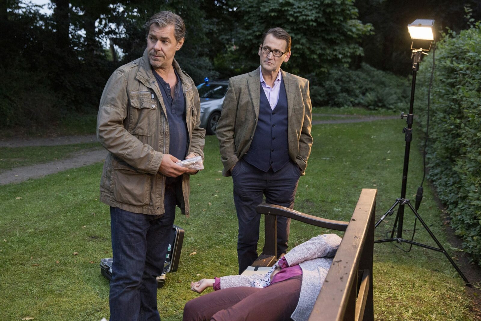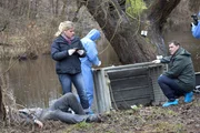EiskindDie 16-jährige Ira Jakobi (Komparsin, liegend) wurde ermordet. Lars Englen (Ingo Naujoks, l.) und Finn Kiesewetter (Sven Martinek, r.) finden am Tatort einen Flyer einer Reproduktionsklinik.Bild: © MDR/ARD/Georges Pauly