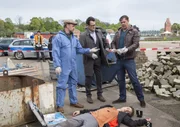 Leonies letzter AbendEin alter Fall Finn Kiesewetters erfährt neue Brisanz: Bei Straßenarbeiten wird die Leiche eines jungen Mädchens gefunden, das vor 15 Jahren nach einem Klassenfest spurlos verschwand. V.l.n.r. Finn (Sven Martinek), Schroeter (Veit Stübner), Lars (Ingo Naujoks) und Nina (Julia Schäfle)Bild: © ARD/Georges Pauly