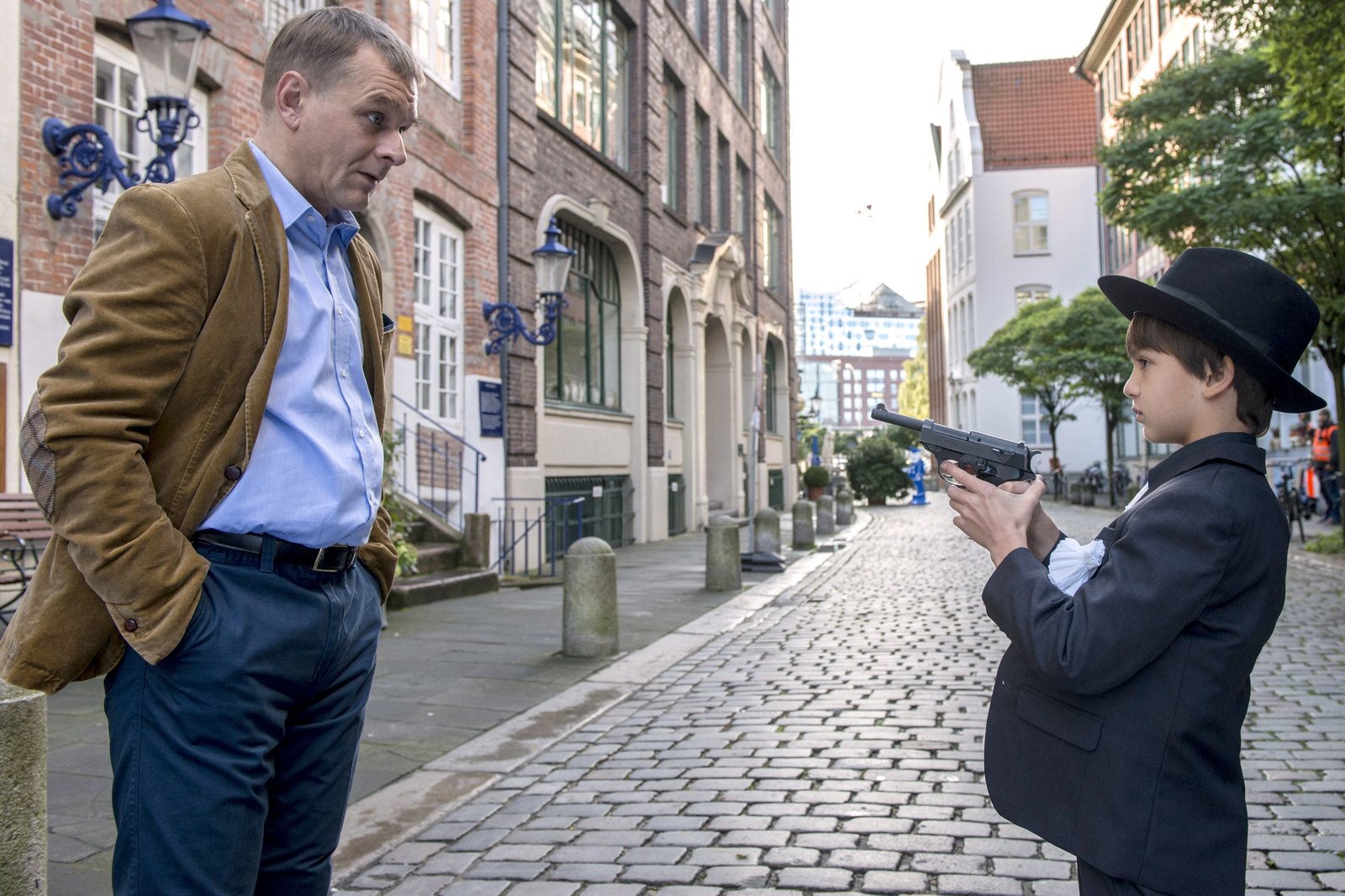 Schuss ins BlaueMDR Fernsehen MORDEN IM NORDEN FOLGE 21, "Schuss ins Blaue", am Montag (08.06.15) um 22:50 Uhr. Der kleine Florian (Kian Lars Parsiani-Schmidt, r.) aus dem Kinderheim St. Gertrud bedroht am helllichten Tag als Mafiosi verkleidet den Anwalt Bender (Hans Christoph Michel, l.) mit einer Waffe.Bild: © MDR/Georges Pauly