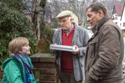 Auf Herz und NierenFinn Kiesewetter (Sven Martinek, r.) spricht mit Luca Niemann (Lennox Krause, l.) und Opa Fischer (Charles Brauer, M.), dem Sohn und Vater der verstorbenen Patientin von Dr. Unger, Ute Niemann.Bild: © MDR/Georges Pauly