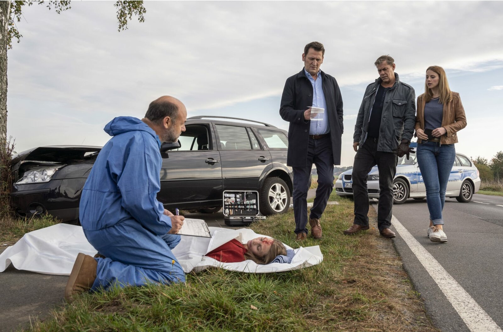 VollgasKarolin Böhm (Anna Katharina Schwabroh, liegend) ist auf gerader Strecke gegen einen Baum gefahren und ihren schweren Verletzungen erlegen. Ist es Mord? Wurde sie von der Straße gedrängt? V.l.n.r. Dr. Strahl (Christoph Tomanek), Lars (Ingo Naujoks), Finn (Sven Martinek), Nina (Julia Schäfle)Bild: © SWR/ARD/Georges Pauly