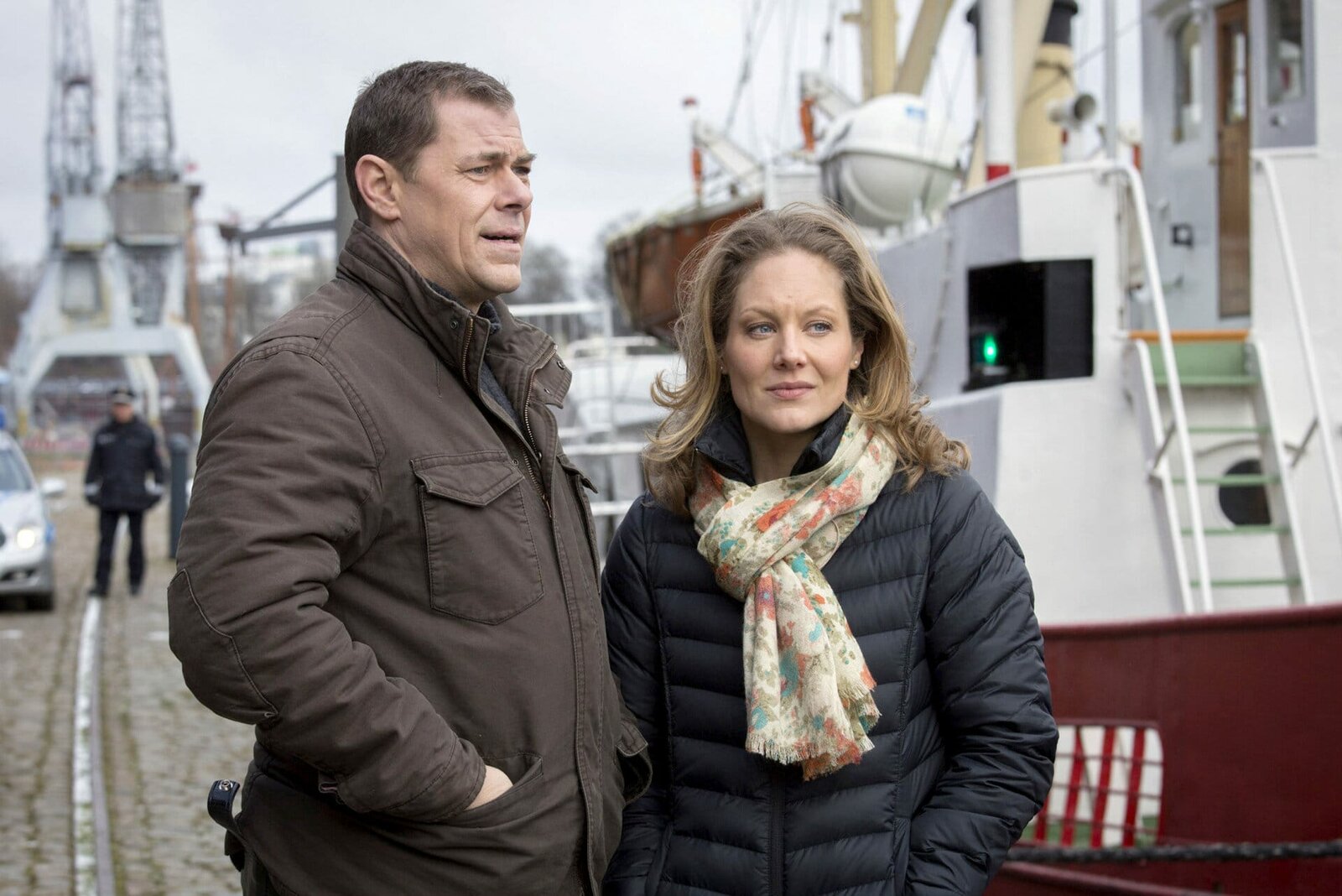 Über BordNDR Fernsehen HEITER BIS TÖDLICH: MORDEN IM NORDEN, "Über Bord", am Donnerstag (04.06.15) um 23:30 Uhr. Aufregung im Lübecker Hafen. Die Besatzung eines Feuerwehrschiffs hat einen Toten aus dem Wasser gezogen. Finn (Sven Martinek, l.) und Elke (Tessa Mittelstaedt, r.) wollen sich ein Bild vor Ort machen.Bild: © WDR/ARD/Georges Pauly