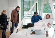 Tödliche HeilungDer selbst ernannte Wunderheiler Martin Neuenfels (Tobias Kay, r.) wird in seinem Haus ermordet und an seine Behandlungsliege gefesselt aufgefunden. V.l.n.r. Sandra Schwartenbeck (Marie-Luise Schramm), Finn Kiesewetter (Sven Martinek), Dr. Strahl (Christoph Tomanek), Martin Neuenfels (Tobias Kay).Bild: © HR/ARD/Georges Pauly