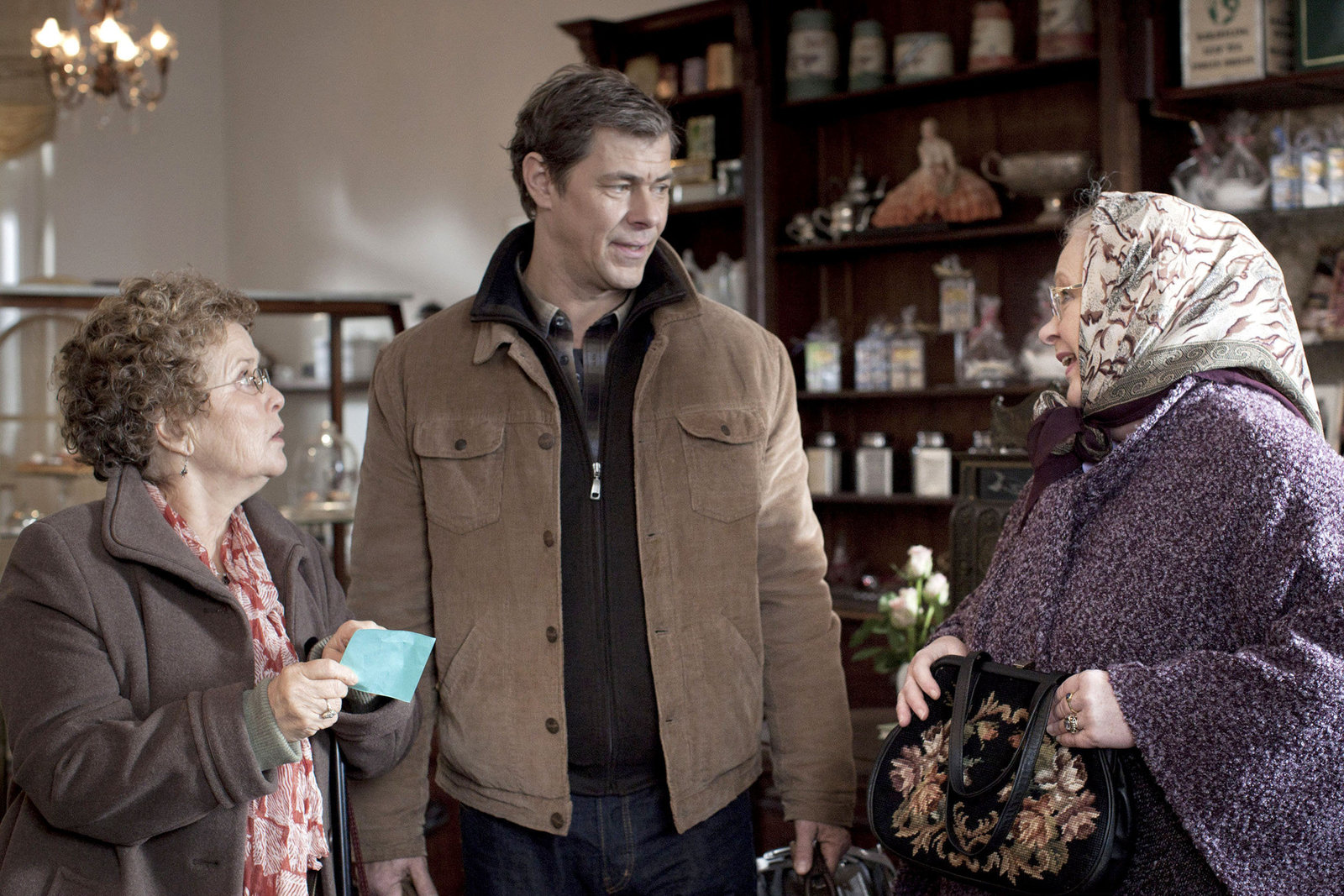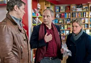 Der FrauenflüstererDer Verleger Gustav Erikson wurde erschlagen. Sandra Schwartenbeck (Marie-Luise Schramm, r.) und Finn Kiesewetter (Sven Martinek , l.) sprechen mit dem Tatverdächtigen Didier Moretti (Michael Lott, M.), Lübecker Autor des Bestsellers "Dirigent der Liebe".Bild: © HR/ARD/Georges Pauly